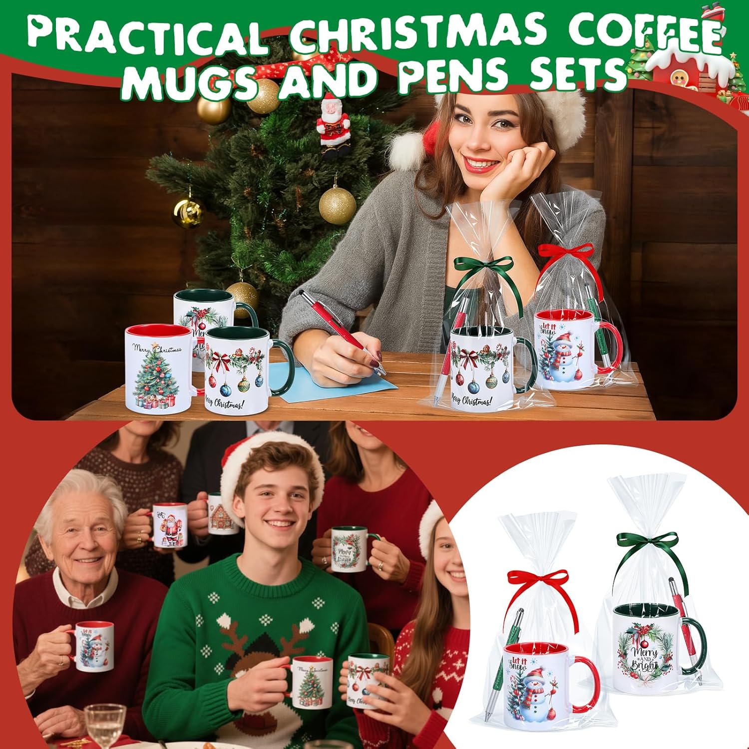 Features: Christmas gifts: our Christmas mugs and Christmas ballpoint pens are an ideal Christmas gifts for men, women, couples, wife, husband, family, friends, colleague. Wish them a fantastic Christmas. Versatile and convenient: each Christmas mug measures approximately 3.94 x 3.15 inches/ 10 x 8 cm, 12 oz/ 350 ml of your favorite coffee, tea or other beverage, the right size and capacity for you to use. Specifications: Quantity: 6 sets Material: ceramic Color: mainly red, green Size: 3.94 x 3.15 inches/10 x 8 cm, 12 oz/350 ml Package includes: 6 x Christmas coffee mug 6 x 6 in 1 multitool pens 6 x Clear opp bags 2 x Rolls of red green ribbons Notes: Manual measurement, please allow slight errors on size. Due to the screen display, the color of the item may differ slightly from the picture