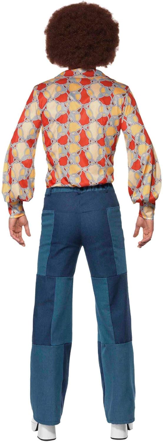 1970s Retro Costume, Blue, with Shirt & Patchwork Denim Trousers Head to that 70s party in style with the 1970's Retro Costume. This out-there outfit includes a Blue shirt and patchwork denim trousers, and will have you destroying the dancefloor at your net fancy dress party or event. It's perfect for men and a great costume for that throwback seventies party. You'll look totally groovy baby! For added seventies style don't forget the Seventies Specs and our 70's Funky Afro. Washing Instructions: Dry Clean Only Product Code: 22277