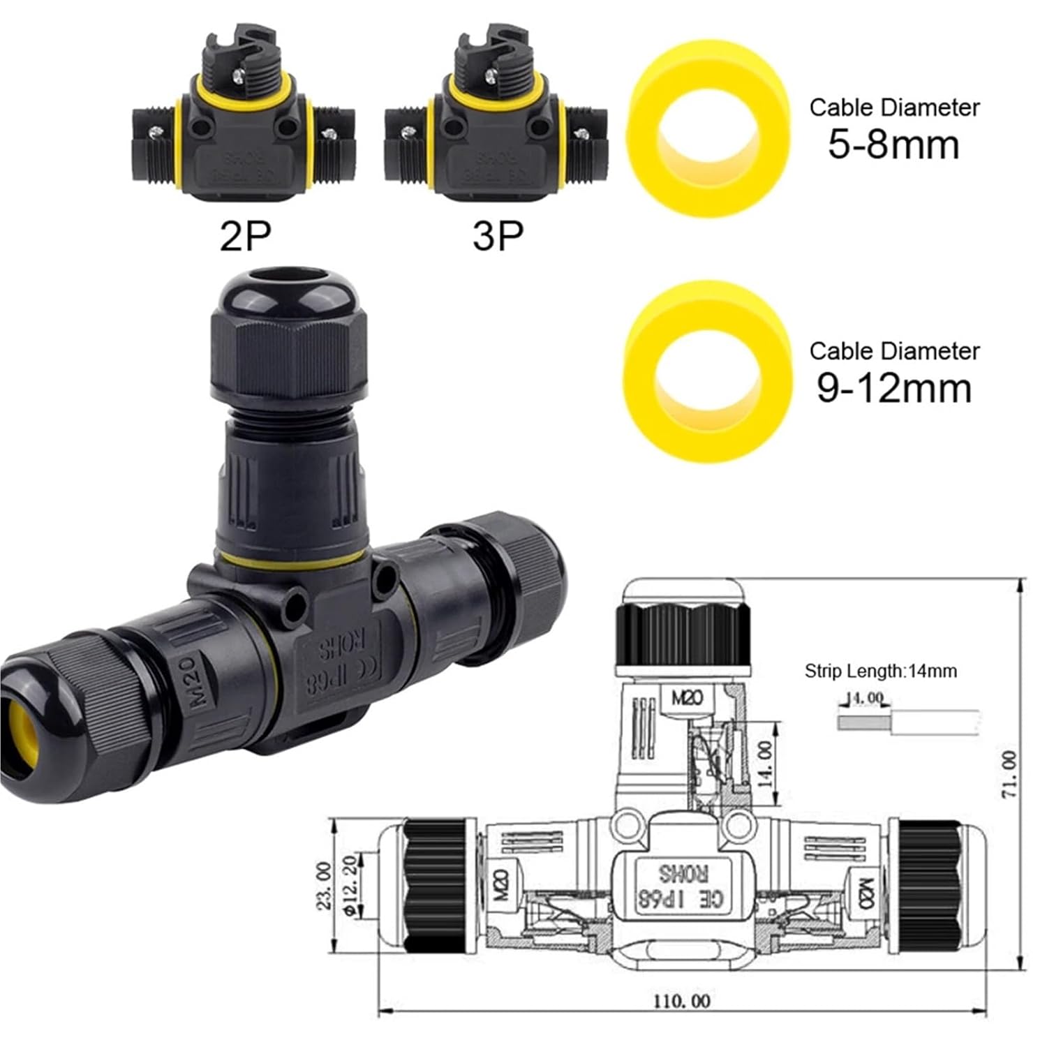 ConnectorsProducts name : Waterproof outdoor Connectorjunction box Material : Nylon PA66 flame-ratardant,Silica-gel Rubber ringConnect Type: M20 T Type 2/3 Pin screw terminalWaterproof level : IP68Wire range : Ø5-8mm/9-12mm ,suit for most usually power cordWiring range: 0.5-2.5mm²Rated voltage: 380vRated current: 16AWide Usability : The electrical junction boxes Suitable for kinds of LED billboards, tunnel lights, Road landscape lighting,outdoor display, garden electrical lights external .Further applications in coastal, river, sea or underwater engineering, underground engineering, mining engineering, solar-wind power, solar water heaters, various machinery and equipment.==========Hign-concerned Chemical : NoneModel Number : IP68 T-type 3 Way M20 Waterproof ConnectorVoltage : 380V