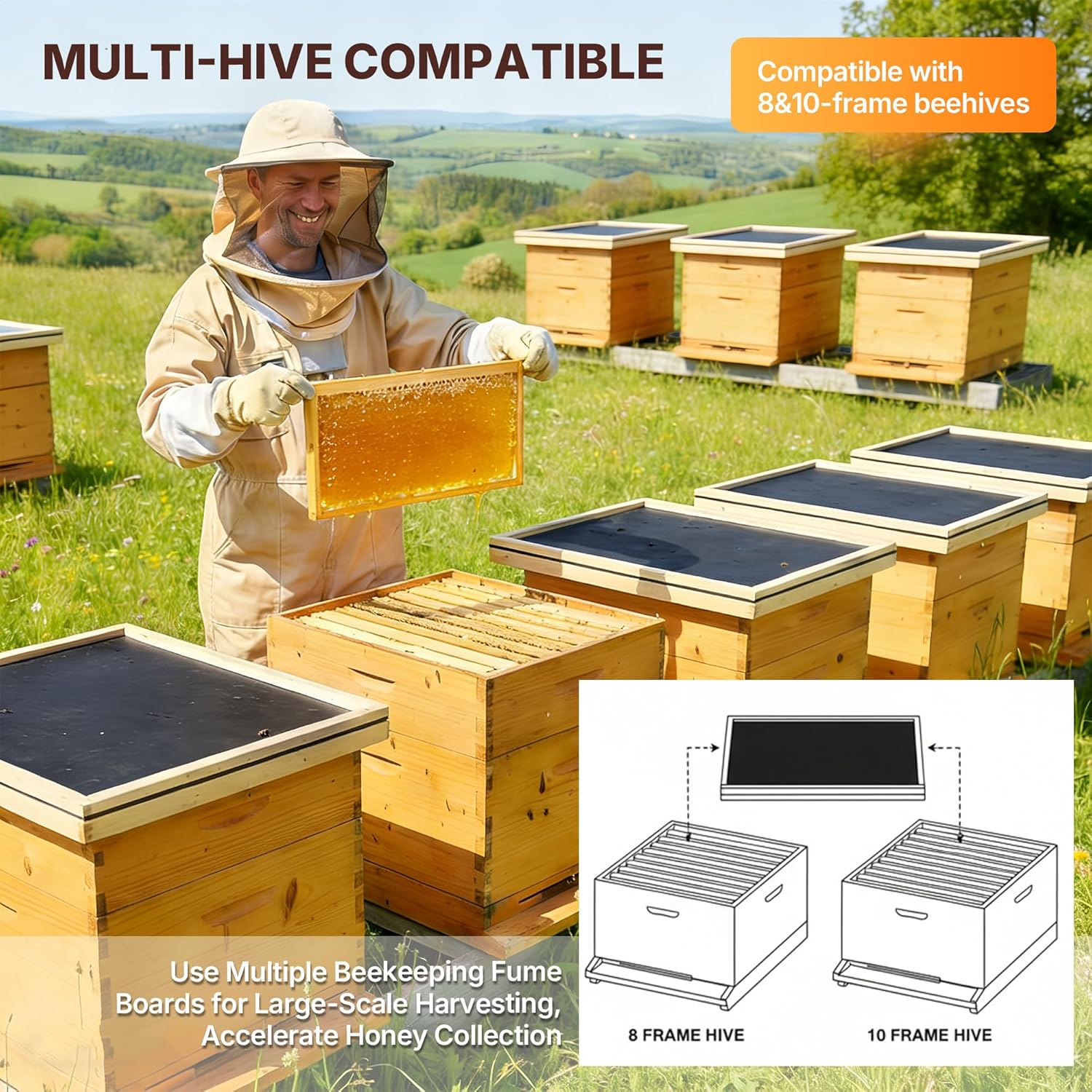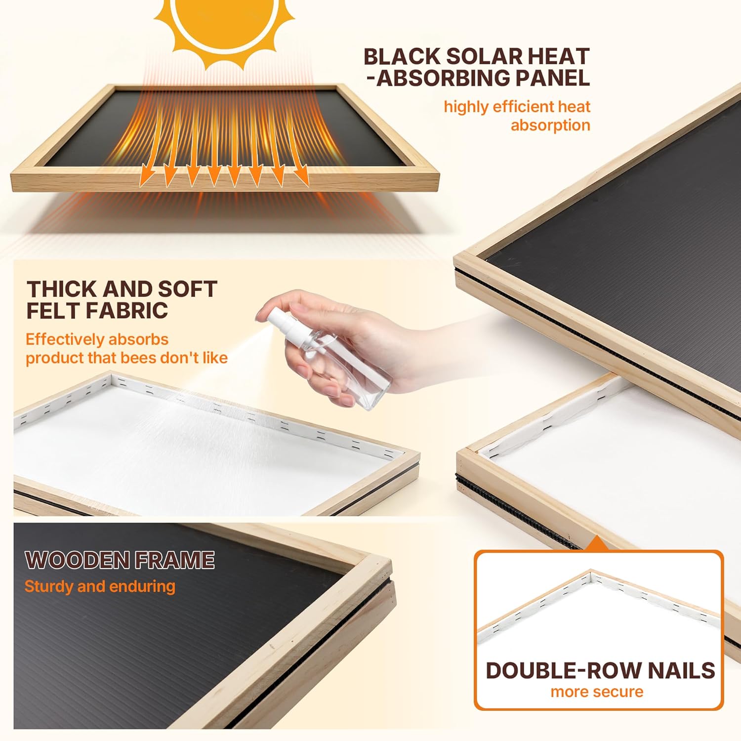 Ideal for both 8-frame and 10-frame beehives with its 20" L x 16" W dimension. Crafted with a black polypropylene heat-absorbing panel, thick felt fabric, and a sturdy wooden frame, it’s assembled via a dual process of adhesive bonding and nailing, ensuring exceptional durability to withstand long-term outdoor beekeeping conditions. A must-have tool for every beekeeper chasing efficiency and bee-friendly practices!