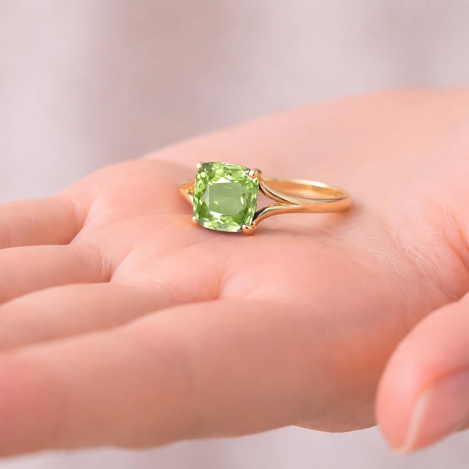 This Handmade Cushion Shape Split Shank Solitaire Engagement Ring Is made from high-quality 925 sterling silver, known for its lustrous appearance and durability.. It is available in 14K White, Yellow, and Rose Gold Plating with Highly Glossy Finished. It features Simulated Cushion Cut Green Peridot Stones set in bezel Setting. The Anniversary Wedding Matching Ring is easy to use, Perfect for any occasion.