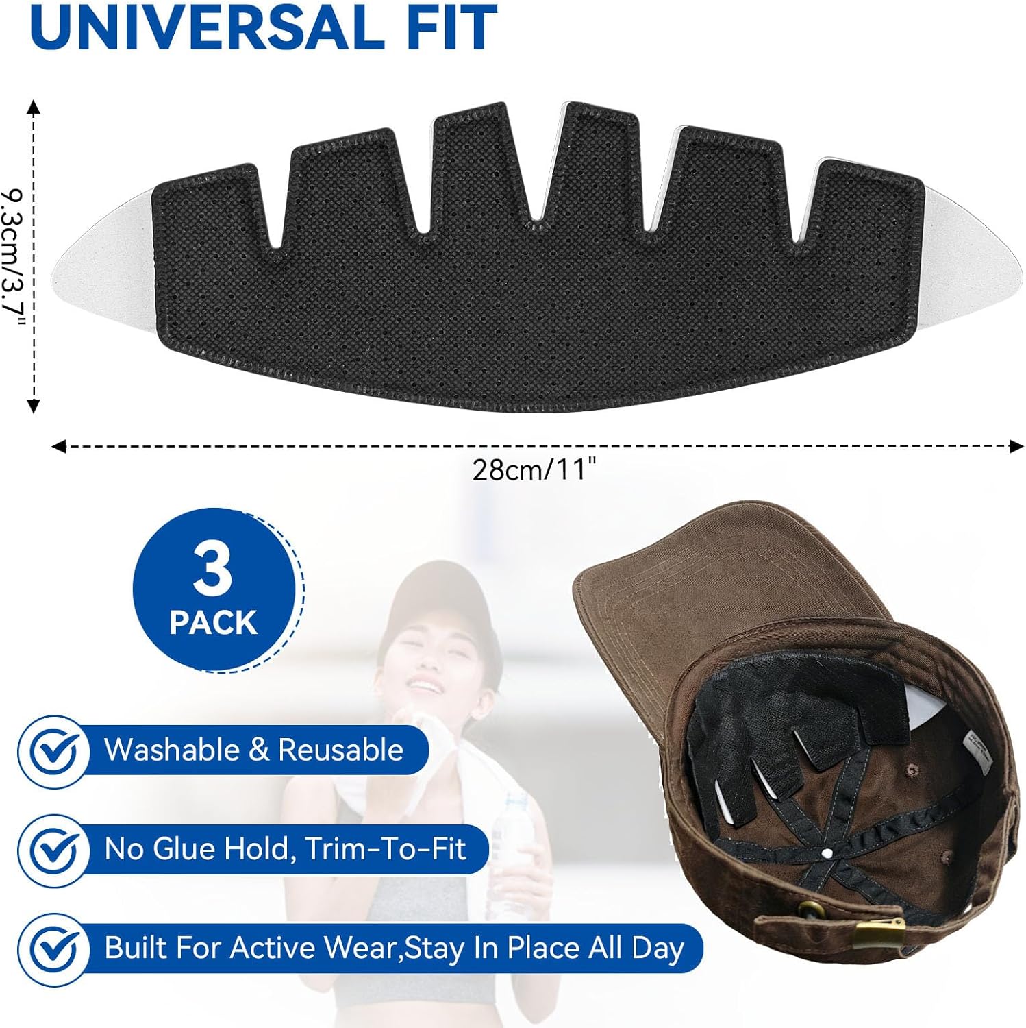 Color: BlackSize: About 11x3.7 inches / 28x9.3 cmFabric type: non-woven fabric, syn cotton core, vinyl barrierFeatures: Non-Adhesive,Reusable,Washable,Hidden & DiscreetWhat You Get3 x Hat Sweat Liners(Black)Keeps Sweat Away, Stays Dry And ComfortableCrafted from syn cotton core + vinyl barrier, the hat liners sweat protection provide premium multi-layer absorption,wicks sweat away from your skin to reduce dampness and provide lasting comfort during golf, hunting, hiking, or work,protect from drips, makeup smears, and hat stains.Washable & ReusableGlue-free construction allows quick attach and removal, making it easy to clean and reuse. Durable, breathable, and eco-friendly, it extends the life of your hats while reducing waste,offering a smarter alternative to disposable hat sweat liners.Multi-Layer Design, Built for Active Wear Heat-sealed non-woven fabric combined with synthetic cotton delivers excellent sweat absorption while resisting odors, helping keep hats fresh longer. Designed for golfers and outdoor athletes, these hat sweatbands handle sweat during long rounds, workouts, and outdoor activities without slipping or discomfort.