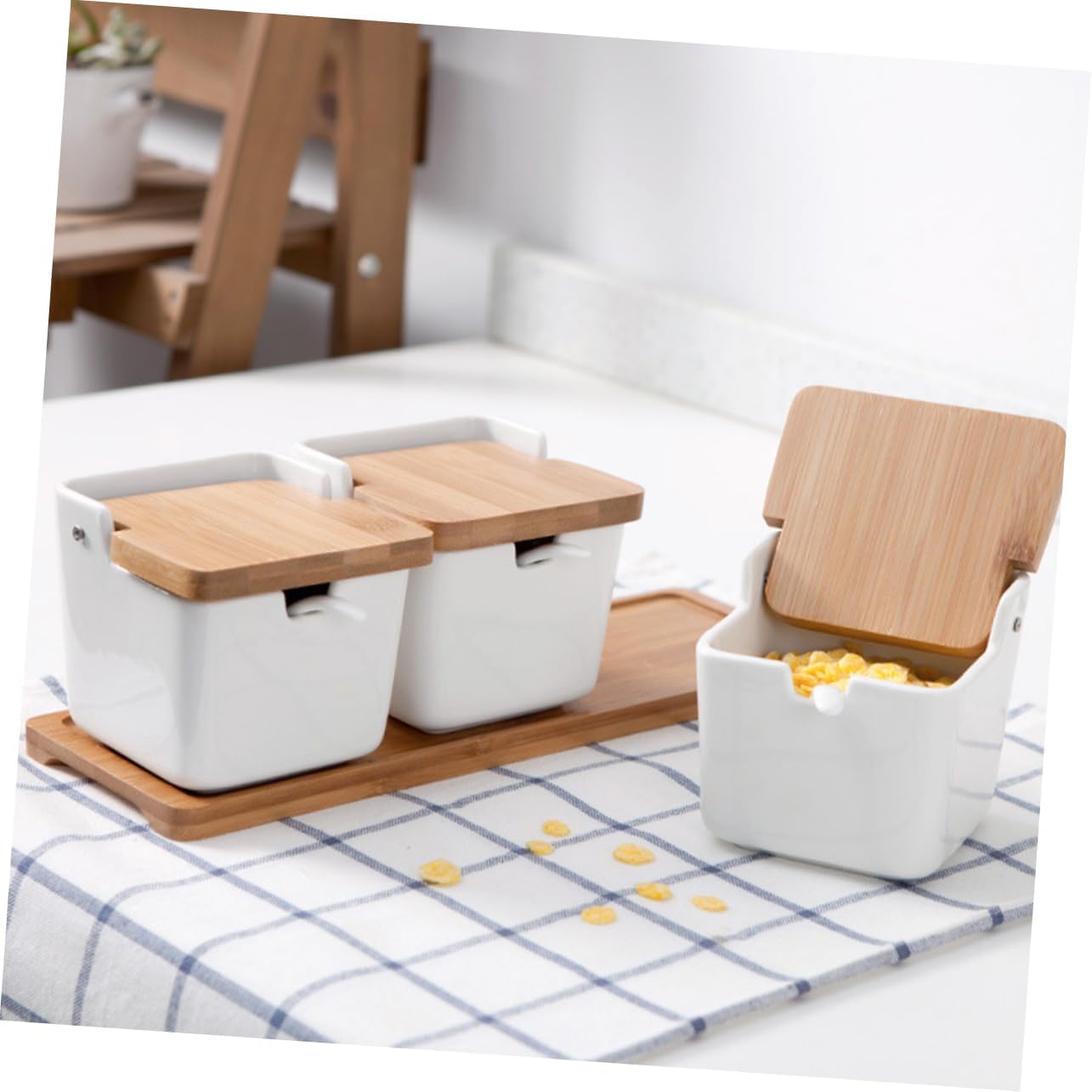 Package Include 3 x square jars with wood lid, 3 x spoons Characteristics -Material: Ceramic and wood simple seasoning bottles. -Color:White powder pots -Size: About 32.00X9.50X9.50cm / 12.58X3.73X3.73inch salt boxes. - design on the jar is espeically designed for placing spoon condiment containers. -The simple wooden lid is not easy to deform and not easy to fade salt storage bottles. -Each jar can place 250g of edible salt to meet the daily needs of the family practical seasoning boxes. -Made of material with low water absorption powder bottles. - workmanship, comfortable to the touch, easy to containers.Goods Descriptionsquare storage jars workmanship, comfortable to the touch, easy to clean.creative pepper pots Each jar can place 250g of edible salt to meet the daily needs of the family.household seasoning bottles design on the jar is espeically designed for placing spoon.salt storage bottles Made of material with low water absorption.creative salt jars The simple wooden lid is not easy to deform and not easy to fade