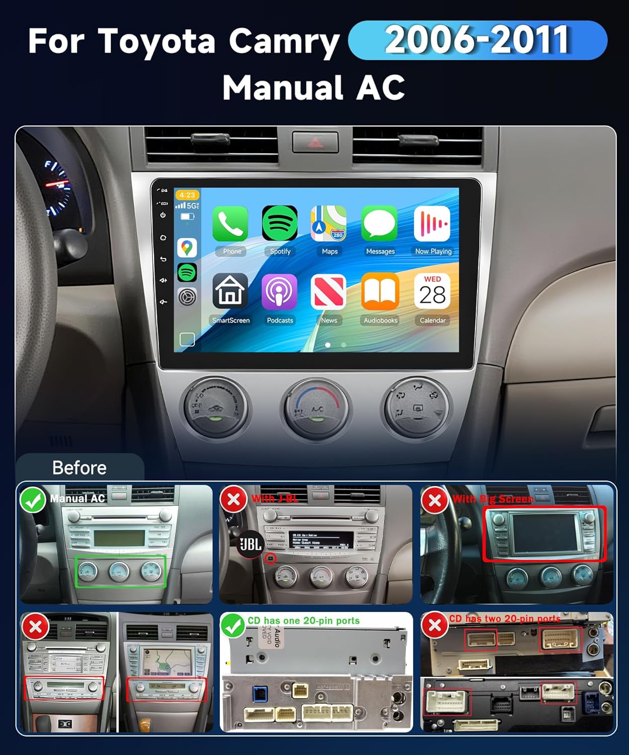 | Additional Features | (Manual A/C) Android Car Stereo for Toyota Camry 2006-2011, 59UI,32EQ AI DSP, GPS, Touchscreen, Wireless CarPlay Android Auto |