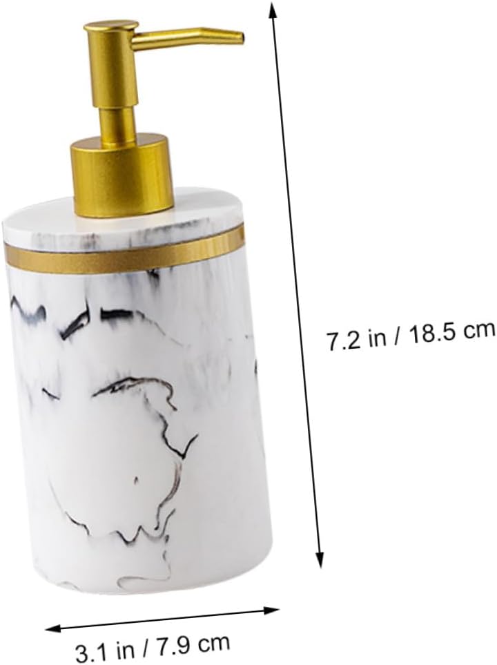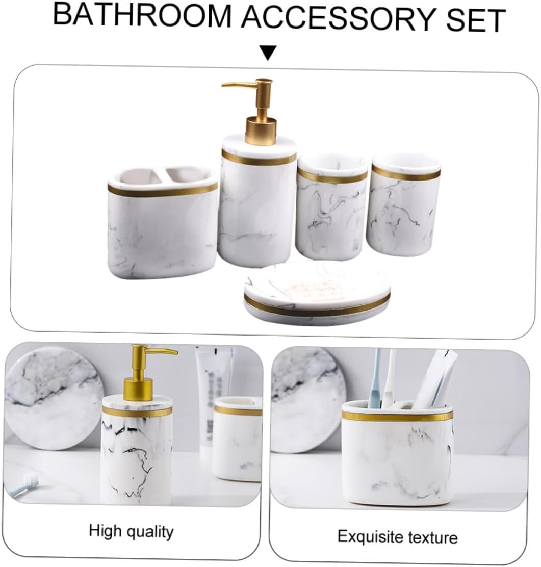 Package Include 1 x Set of 5Pcs Bathroom Accessories Characteristics -Size Soap Dish: Approx. 14.4 x 9.5 cm / 5.67 x 3.74 inch Soap Dish -Size Toothbrush Holder: Approx. 9.6 cm / 3.78 x 4.33 inch Imitation Marbling Lotion Dispenser -Material: Resin Toothbrush Holder -Color: Assorted Color Brushing Cups -Size Mouthwash Cups: Approx. 7.7 x 9.9 cm / 3.03 x 3.89 inch Marbling Bath Accessories -Product Info:Simulated marble toiletry set -Size Lotion Dispenser: Approx. 7.9 x 18.5 cm / 3.1 x 7.27 inch Sanitary Ware - decoration for your bathroom, excellent workmanship and fashion design, they will decorate your home well Mouthwash Cups. - Optimal choice for organizing bathroom stuff and adding style to your room Resin Toothbrush Holder. - You can put them together for use, or you can separate them, very convenient for use Hand Bottle. - The whole appearance design of product is simple and generous Liquid Pump Bottles. - The bottom of the product is designed with non-slip pad, playing a protective role Household Soap Holder.Goods DescriptionHand Bottle Manufactured with resin materials, so that it can serve you for many years.Mouthwash Cups This marbling bath accessory set will your daily life more convenient.Soap Dish This is a set of bathroom accessories, including a lotion pump bottle, a soap dish, 2 mouthwash cups and a toothbrush holder.Imitation Marbling Lotion Dispenser material that can ensure its durability and practicability