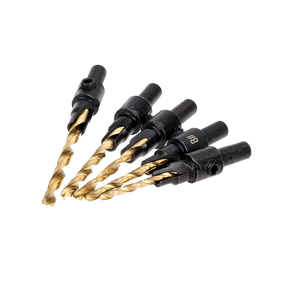 Four piece set includes bits for drilling holes for screw sizes #5, #6,#8,#10 and #12.Special designed steel counter sleeve countersinks or counter bores hole.Adjustable counter sleeve depth with Allen wrench.Standard hex shank is quick change compatible.Drill and countersink for wood screws without changing bits.-Drilling length can be adjusted for various length screws simply by loosening and tightening the setscrewSpecifications:-Color: As the pictures show-Material: HSS Drill 4241-Black chamfer drill body material: steel 45Dimension:-5# 1.98mm(0.07795 inch)x 50mm(L)-6# 2.38mm (0.0937 inch) x 55mm(L)-8# 2.78mm (0.1094 inch) x 60mm(L)-10# 3.175mm (0.125 inch) x 63mm(L)-12# 3.56mm (0.14 inch) x 65mm(L)-Shank: 1/4 hex shankNo need for shaking or reducing friction, capable of withstanding heavy-load operations, making the cutting process smoother