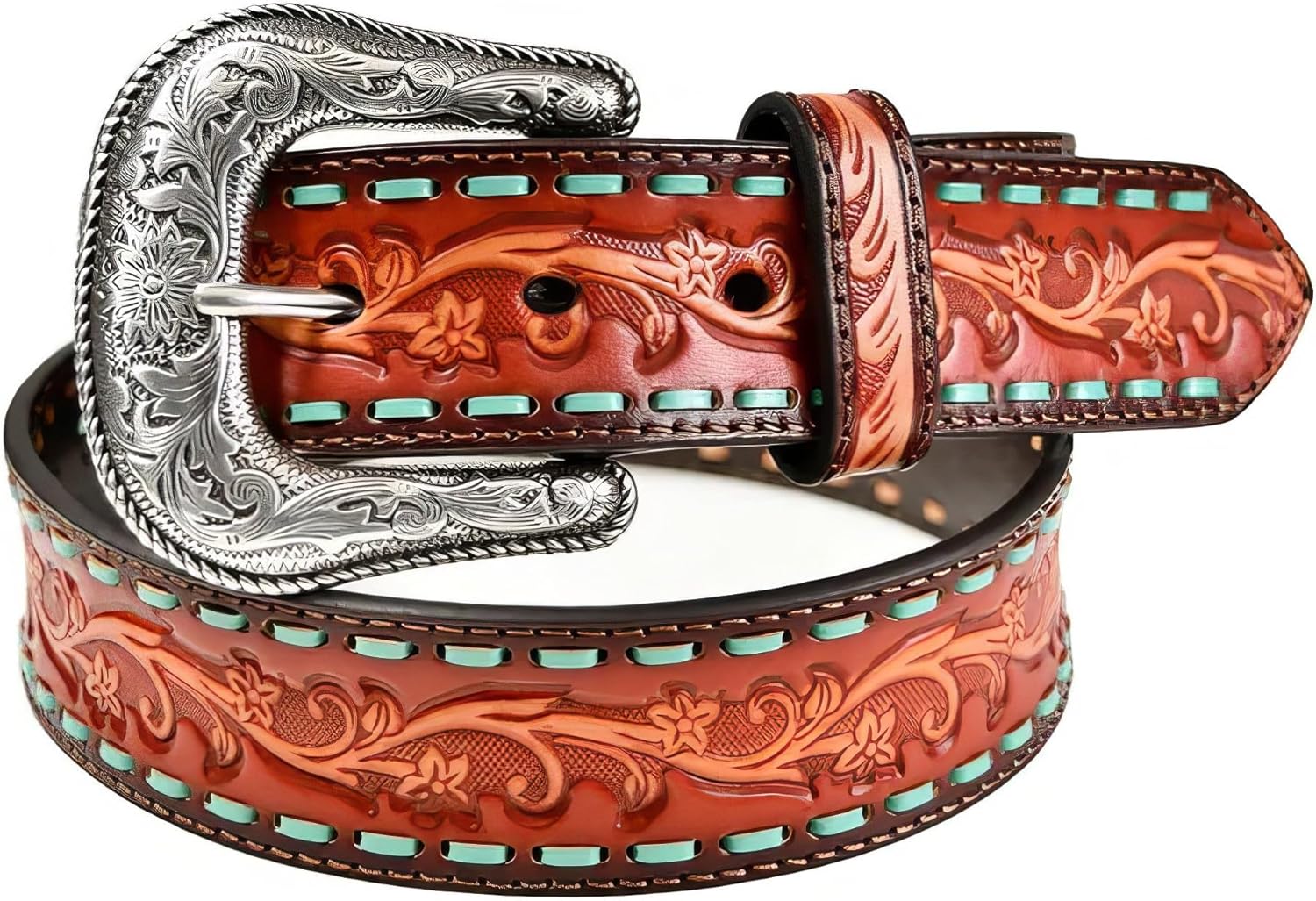 With bold detail and unmistakable Western flair, the ARIAT Women's Turquoise Buck Lace Stitched Tooled Leather Belt brings handcrafted character to any outfit. Made from genuine leather, the belt features a rich floral tooling pattern set against a deep brown strap, bordered by vibrant turquoise buck lace stitching that makes every detail pop. Paired with a beautifully engraved silver-tone buckle that’s fully removable, this belt offers a standout look that works as easily with jeans and boots as it does dressing up for the county fair or rodeo night. For the woman who wants her accessories to reflect her grit and style, this belt makes every outfit feel a little more confident.
