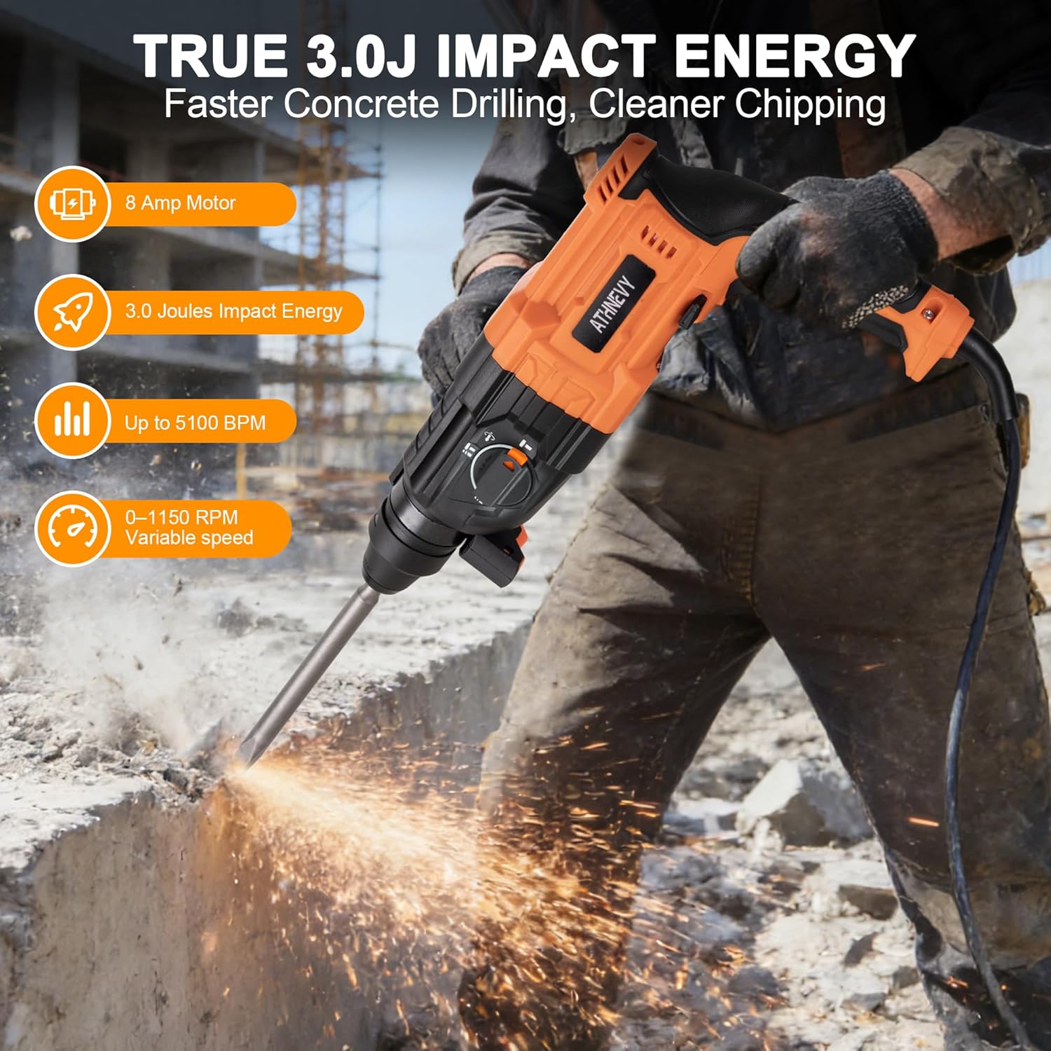 | Included Components | 1 SDS-Plus drill chuck with adapter, 1 chuck key, 1 depth gauge, 1 pointed chisel, 1 flat chisel, 2pcs Carbon brush and 1 carrying case, 3pcs SDS-Plus drill bits |