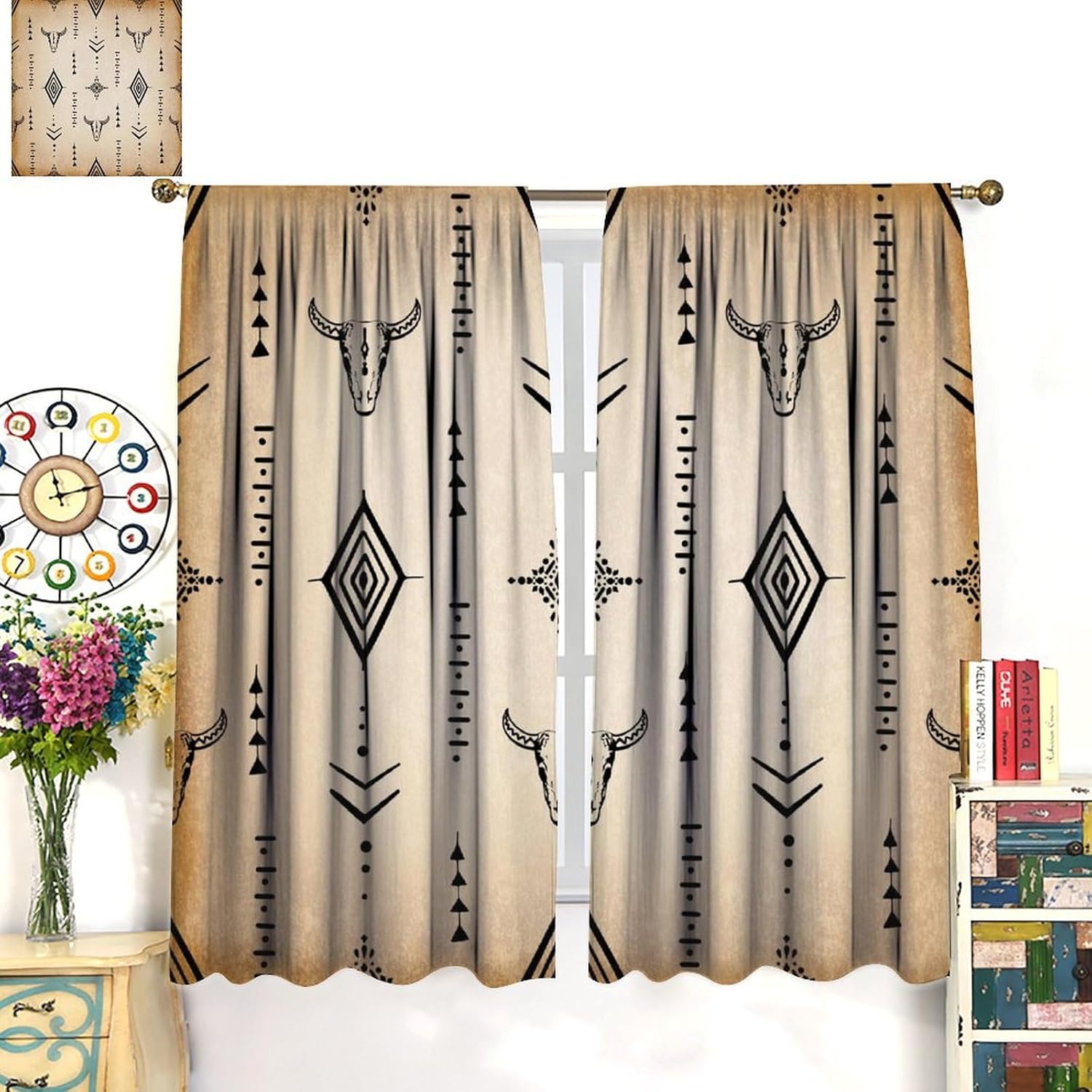 Curtains Package Includes:Blackout Window Curtains 2 panelsSize:1 panel measures 21 (W) x 45(L). The pair of 2 panels together measures 42" (W) x 45" (L) .1 panel measures 21 (W) x 54(L). The pair of 2 panels together measures 42" (W) x 54" (L) .1 panel measures 21 (W) x 63(L). The pair of 2 panels together measures 42" (W) x 63" (L) .1 panel measures 27.5 (W) x 63(L). The pair of 2 panels together measures 55" (W) x 63" (L) .1 panel measures 31.5 (W) x 63(L). The pair of 2 panels together measures 63" (W) x 63" (L) .1 panel measures 31.5 (W) x 72(L). The pair of 2 panels together measures 63" (W) x 72" (L) .1 panel measures 36 (W) x 63(L). The pair of 2 panels together measures 72" (W) x 63" (L) .1 panel measures 42 (W) x 84(L). The pair of 2 panels together measures 84" (W) x 84" (L) .1 panel measures 26 (W) x 84(L). The pair of 2 panels together measures 52" (W) x 84" (L) .Various sizes are available.About the material:Polyester fabricNo chemical coating, no peculiar smell, healthier and safer for people, especially babies and kids. About the function:1:It can block more than 85% of the sunlight and provide privacy protection 2:Perfect for bedroom, living room, kitchen, cafe, office, bathroom, dining room, dorm, nursery, outdoor patio etc. 3:It is also one of the best gifts for your family, friends, relatives or yourself.Warm Notice:1:The pattern is only 1 side and the other is white.2:Due to manual measurement, please kindly allow a 1-2 cm discrepancy.