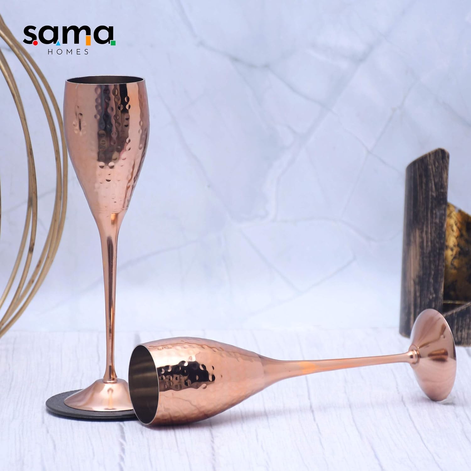 This golden round long stemmed Ayas Vintage cocktail glasses from SAMA Homes are a testimony to the versatility of brass. These cocktail glasses flaunt a hammered exterior, infusing a look of handcrafted dexterity into its posh aesthetic. Swirl the drink of your choice and feel its taste get layered with every sip. Brass not only enriches your beverages and acts as a natural anti contaminant, but it also mingles a sweet taste of metal that leaves you yearning for more. Disclaimer: All other items in the image are only for display purposes and will not be a part of the delivery content.