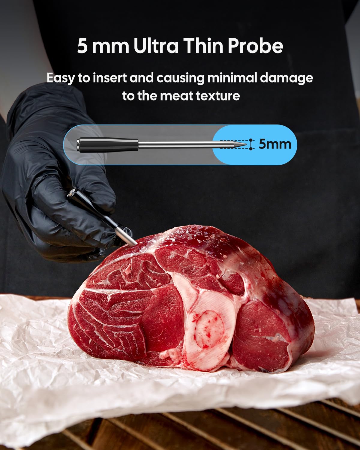 Description NOTE: THIS PRODUCT IS NOT SUITABLE FOR USE IN PRESSURE COOKERS OR MICRO OVENS. The Fitflavor bluetooth wireless meat thermometer is a smart, wireless meat thermometer that supports a stable and efficient connection through Bluetooth 5.4 technology, no worry about signal problems during cooking. It is equipped with a clear HD LCD screen, which displays food internal temperature and ambient temperature in real time, providing a clear overview of the cooking process. Specifications Probe Material: Food-grade stainless steel with alumina ceramic handle Probe Size: φ 5mm Screen Type: HD LCD (0.7 x 1.4 inches) Bluetooth Connectivity: Bluetooth 5.4; 328 wireless range Probe Measurement Range: Food temperature range: 14-212℉ (100℃/212℉ is the ultimate temperature and the highest usable temperature is 96℃/205℉) Ambient temperature range: 32~572℉ Probe Measurement Accuracy:±1.8℉ Probe Response Time: 1 second Temperature Calibration: ±12℉ Probe′s Battery Life: 20 hours Probe′s Charging Time: 30 minutes Base′s Power Source: 2 AAA batteries Base′s Battery Life: 120 hours Package Contents Probe*1 Base*1 AAA Batteries*2 User Manual*1