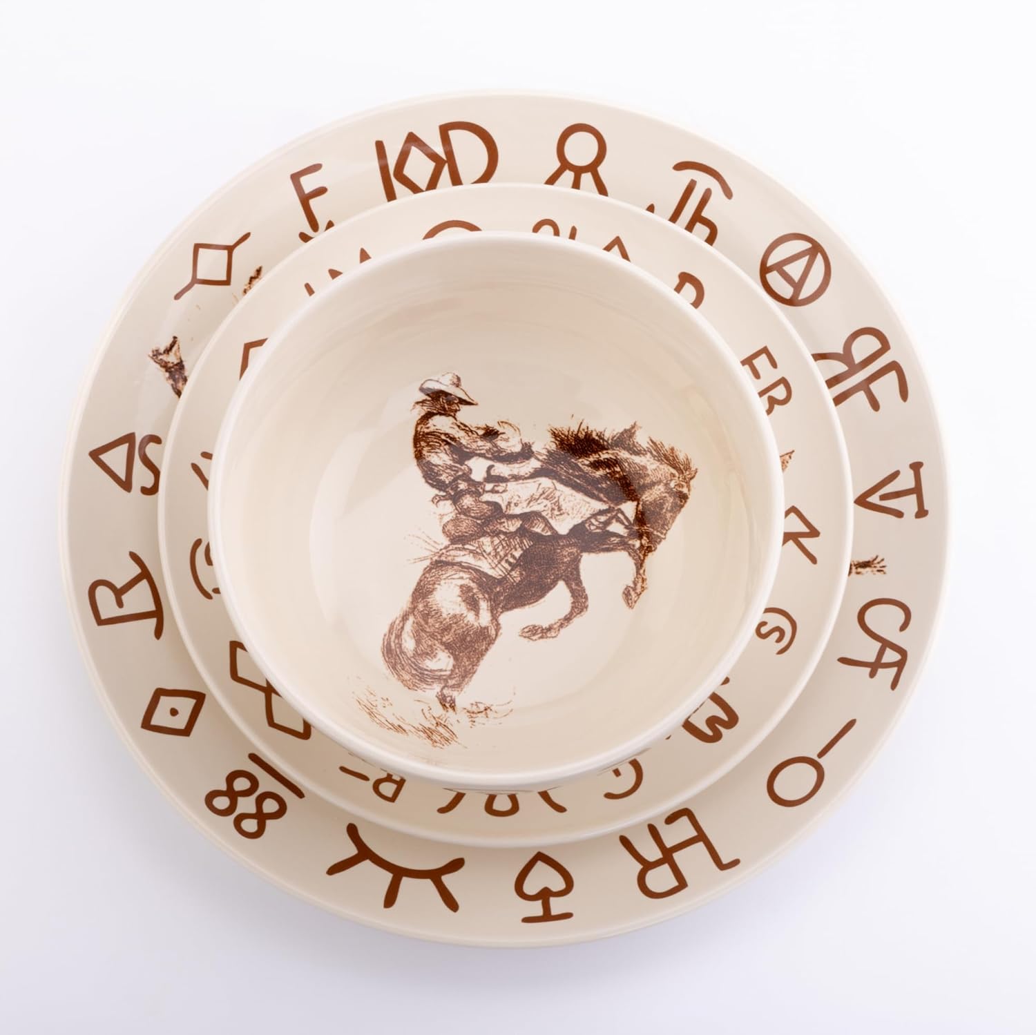 Broncs & Brands 12 Piece Dinnerware Set by Cowboy Living -- Inspired by the artwork of the American West. This is restaurant quality durable porcelain that is dishwasher and microwave safe. The base color is cream. This set includes four 11 inch dinner plates, four 8-1/2 inch side plates, and four 28 ounce dinner bowls.