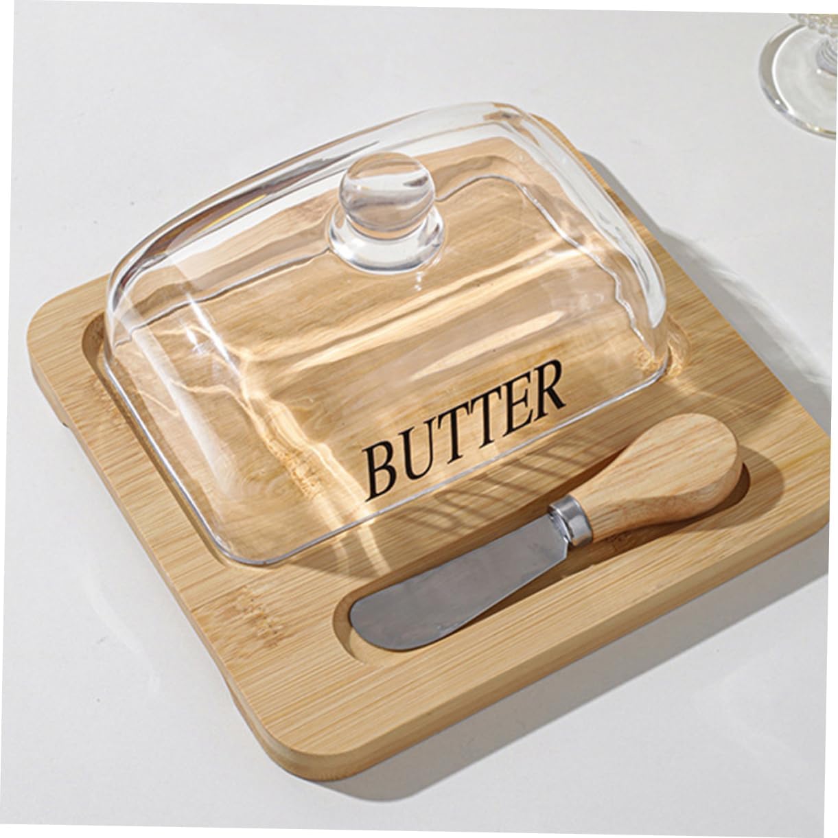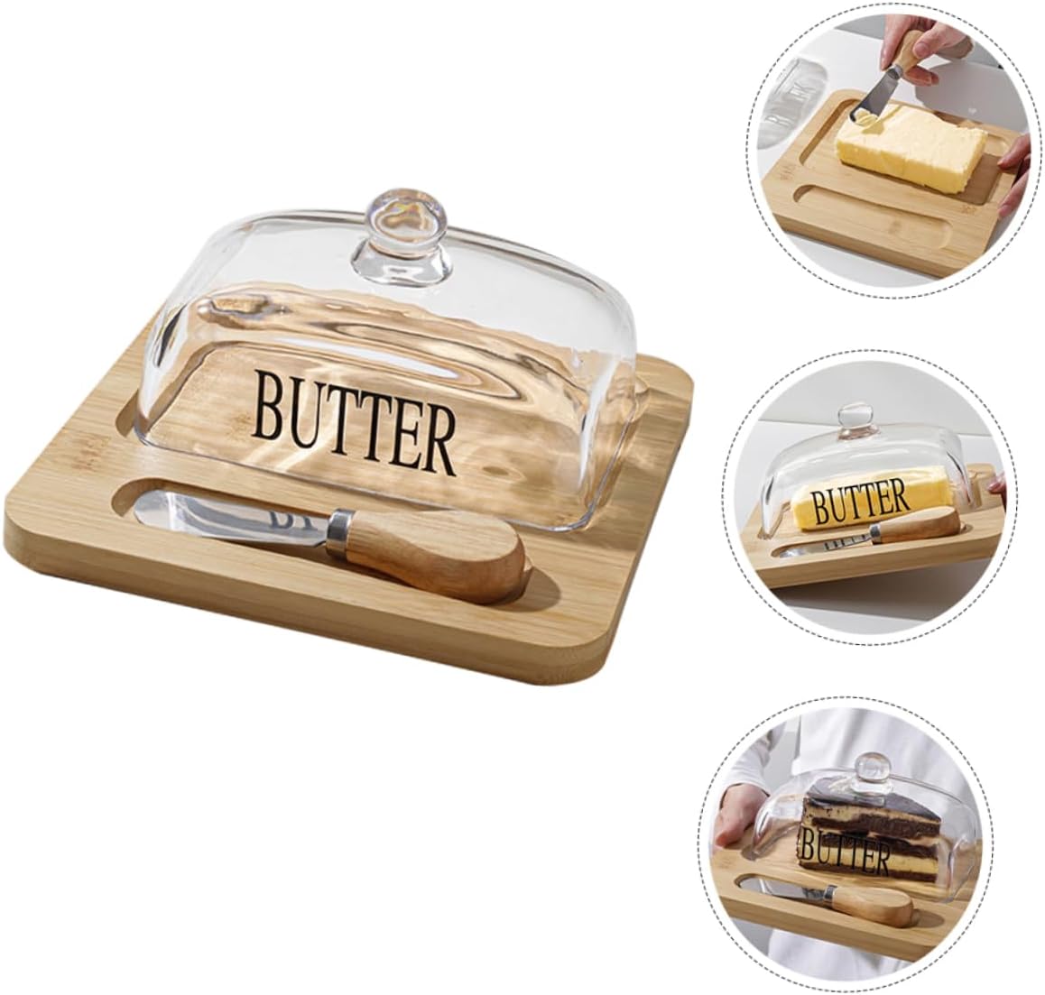 Package List 1 x butter tray 1 x dome 1 x cutter Characteristics -Color:Transparent butter slicing box -Size:19.60X19.00X8.50cm/7.70X7.47X3.34in butter box -Material:Wood, glass, stainless steel butter dish -Size:12.90X3.40X2.00cm/5.07X1.34X0.79in butter case with lid - Utility butter dish with sealing lid to keep your butter fresh, provides a natural style for your kitchen home tableware. - With the lid design, Butter Dish and Lid can keep your cheese or butter clean and safe butter preservation dish. - With this reusable butter dish you can store the butter to not be tainted by other odor butter box with lid. - You will find your kitchen countertop neat and orderly after using it, improving your life greatly butter dish with lid. - This convenient butter keeper matches kinds of butter, to satisfy your daily use Refrigerator butter box.Goods Descriptionbutter dish with lid You can use it to store any type of solid butter or cream cheese.butter cutting tool Household Butter Storage Box, with a sealing cover and a cutting tool for convenient use.butter dish container Let this butter storage box be the stylish kitchen utensil you could ever have