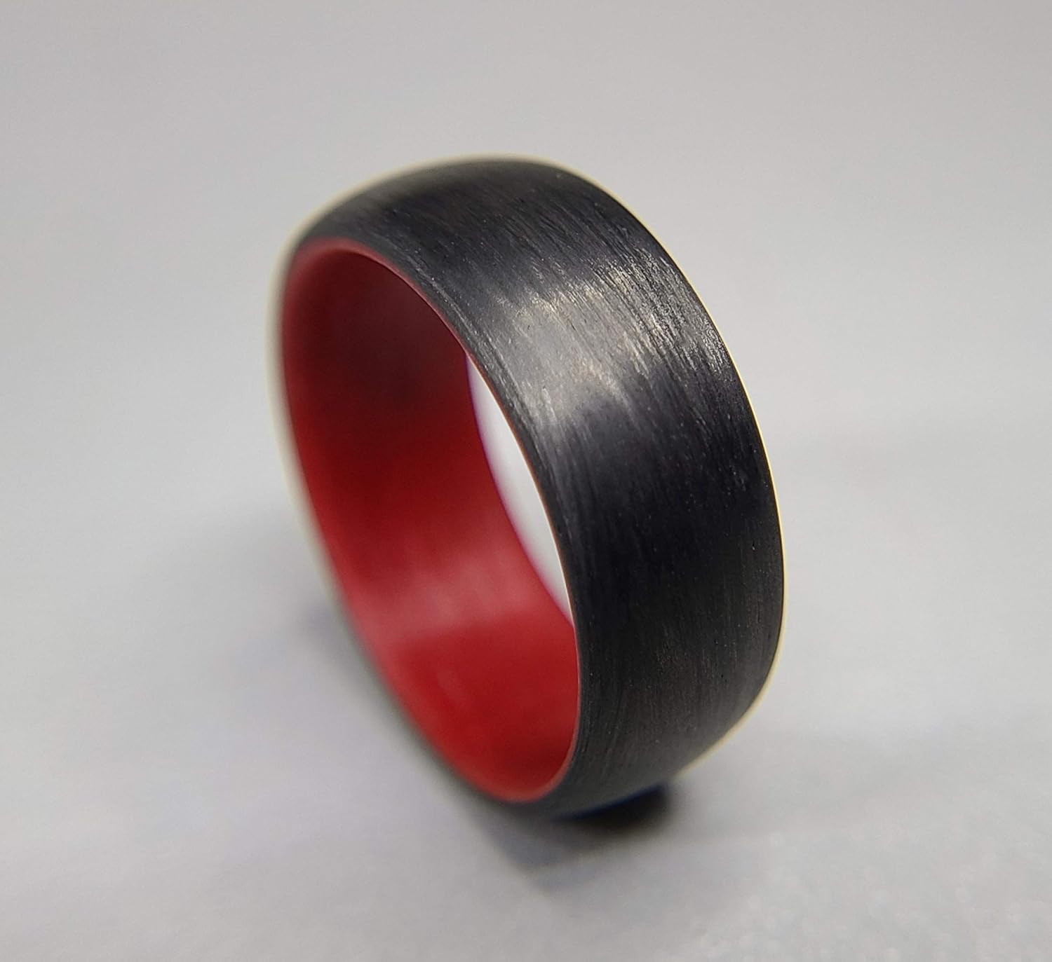 This ring has a traditional rounded black carbon fiber band with a beautiful red interior. The ring is offered in a matte or high gloss finish. The matte finish is extremely durable and scratch resistant. The high gloss finish will give the ring a beautiful depth magnifying the strands of carbon fiber. While the gloss finish is durable for everyday use, the gloss will scratch similar to how gold will. If you are rough with your hands, we would recommend the matte finish. The ring is made with aerospace grade carbon fiber. The ring is durable, waterproof, chemically resistant, hypoallergenic and perfect for everyday use. All of our rings are handcrafted in the USA with a Lifetime Warranty.