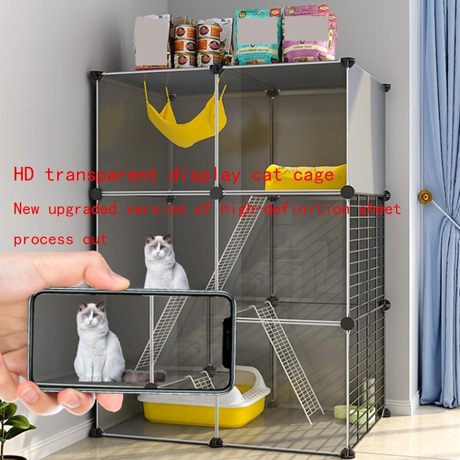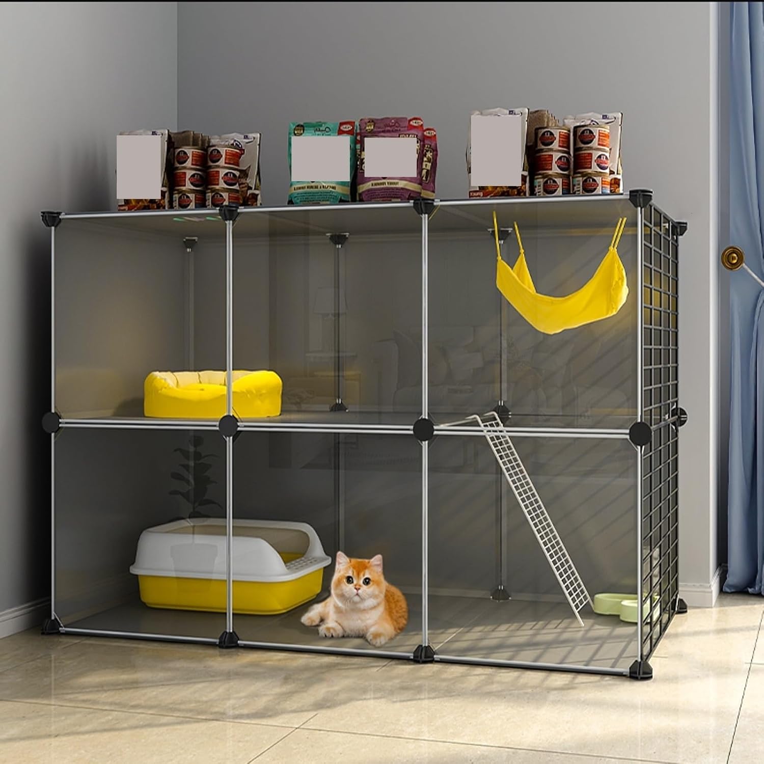 As a cat lover, I choose cat houses more for the comfort of my pets and the reliability of the product itself. Cats like large spaces and high places are more secure for them, so add more resting places, in higher rooms. From keeping a lively kitten safe, to slowly introducing a new cat to the family or providing an older cat with a safe haven, it's all possible. Cattery specifications Name: DIY cat cage / Cat kennels / Cat crate / Cat enclosure / Pet fence / Pet playpen / Cat house / Cat cage villa / Cat apartment cage / Cattery Material: Iron mesh + PP + resin Colors: Black Size: (The size is as shown in the picture) 72*37*72cm , 72*37*72cm(1) , 72*47*72cm , 72*47*72cm(1) , 72*37*107cm , 72*37*107cm(1) , 72*47*107cm , 72*47*107cm(1) , 72*72*72cm , 107*37*72cm , 107*37*72cm(1) , 107*47*72cm , 107*47*72cm(1) , 107*47*107cm , 72*37*82cm , 72*47*82cm , 107*47*82cm Suitable: Cats, guinea pigs and ferrets , Rabbits and other small pets Assembly Required: Yes Packages: A package: reinforcement buckle, hammer B package: reinforcement buckle, hammer, climbing ladder, cat bed, cat bowl, cat teasing stick C package: reinforcement buckle, hammer, cat bed, cat bowl, cat teaser, cat litter box Note: This product includes only one cage in the picture, other accessories in the cage are not included. If you need other accessories, you need to buy the package, there are 3 kinds of packages A,B,C to choose. Packing list: Cat cage *1 Package A/B/C *1
