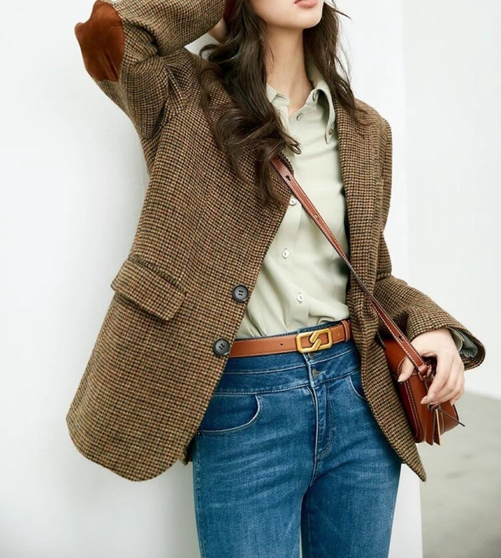 CHARTOU Women Plaid Blazer Jacket Coat/ Polished Checkered Outwear Shacket for Women Casual Business Work/ Single Breasted Overcoat/ Chic Lapel Collared Dressy Jacket/ Wool Blend Jacket/ Checkered Plaid Casual Coat for Women trendy 2025: Classic brown houndstooth plaid delivers retro sophistication, a wardrobe staple that never fades. Contrast leather patches add preppy flair while boosting durability—no wear and tear on sleeves. Relaxed, structured silhouette flatters all body types. Lapels and button-front create polished, effortless style