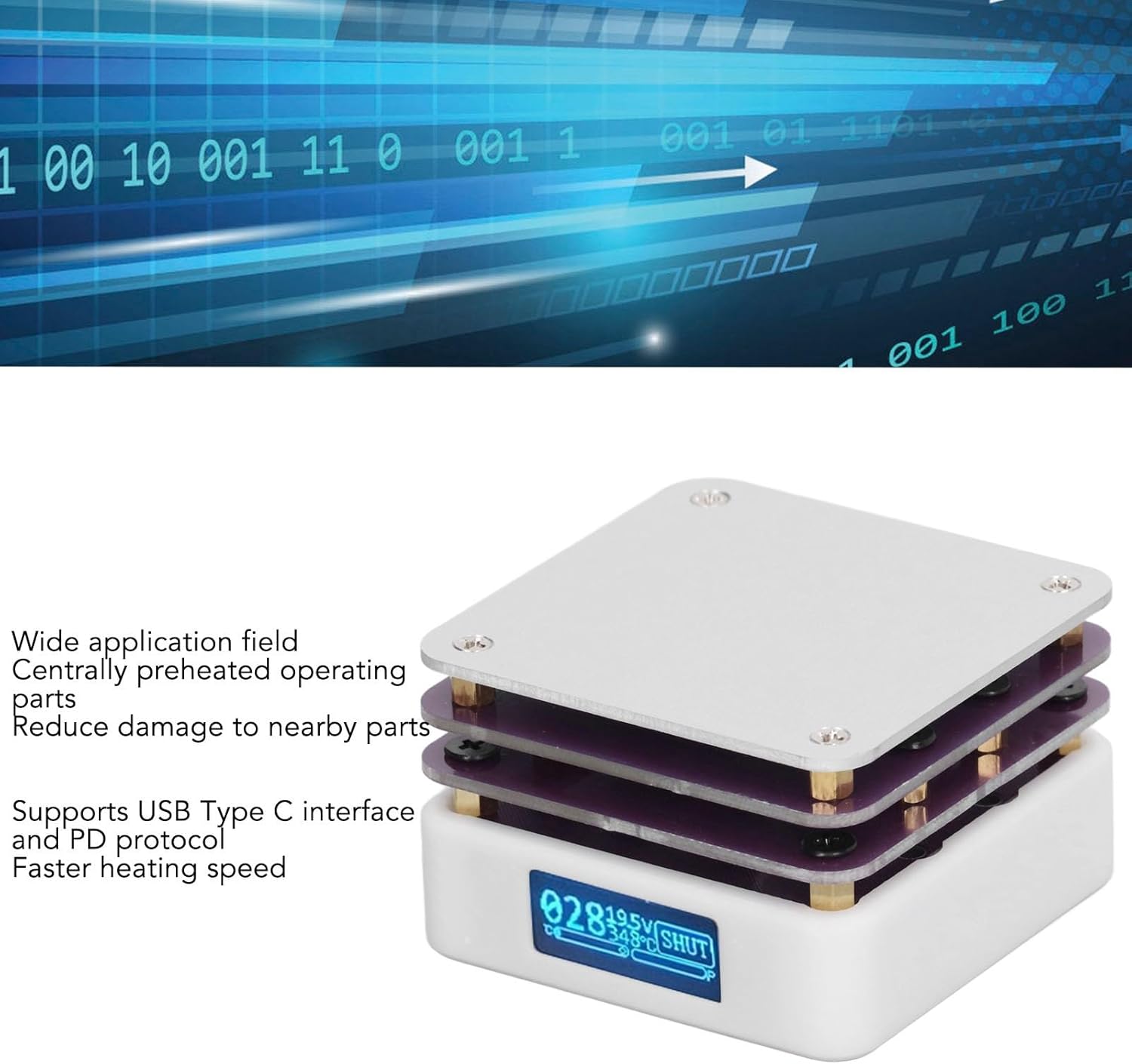 1. MINI THERMOSTAT - Smart thermostatic heating table in super mini size with 3D printed shell without layers 2. FUNCTIONS AND EFFECTS: heating welding plate can eliminate redundant functions, retain sufficient effective heating area, greatly saving energy consumption and heating time 3. DISPLAY AND CONTROL: soldering iron hot plate with organic light-emitting diode display, stand temperature control 4. LOW LOSS: The application field of hot plate for soldering is wide and the operating parts are centrally preheated to reduce the damage to nearby parts 5. FAST & EFFICIENT: The chip soldering station supports USB Type-C interface and PD protocol for faster heating speed Specifications: Item Type: Heating Welding Plate Input interface: Type-C Power supply: PD65W 20V 3.25A (PD65W recommended) Temperature range: 0℃~350℃ (the lowest temperature is the ambient temperature, can be increased, can not be reduced) Case: 3D printed shell, no layers Product size (L x W x H): approx. 5.5 x 5.5 x 3.5 cm/2.2 x 2.2 x 1.4 inches. How to use: 1. Double keys pressed at the same time: Heat or stop heating2. Press and hold twice to enter the menu screen or exit3. Press and hold the double key to confirm Package includes: 1 x Heating Solder Plate Note: 1. The recommended temperature should not exceed 250 ° C. 2. The power supply needs a charger that supports PD protocol, the voltage is 20V 3.25A, and the voltage that PD protocol can support is 20V in theory.