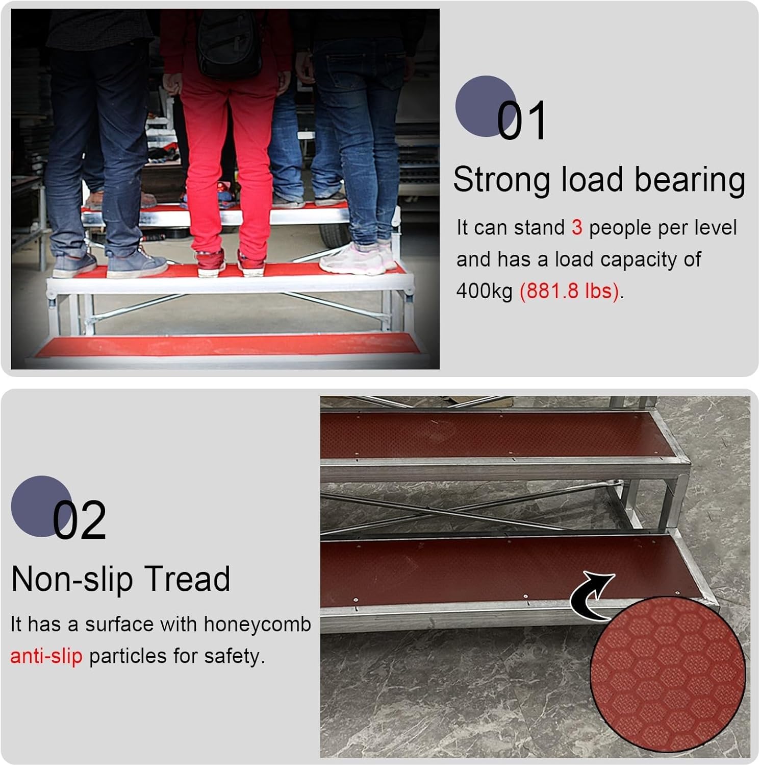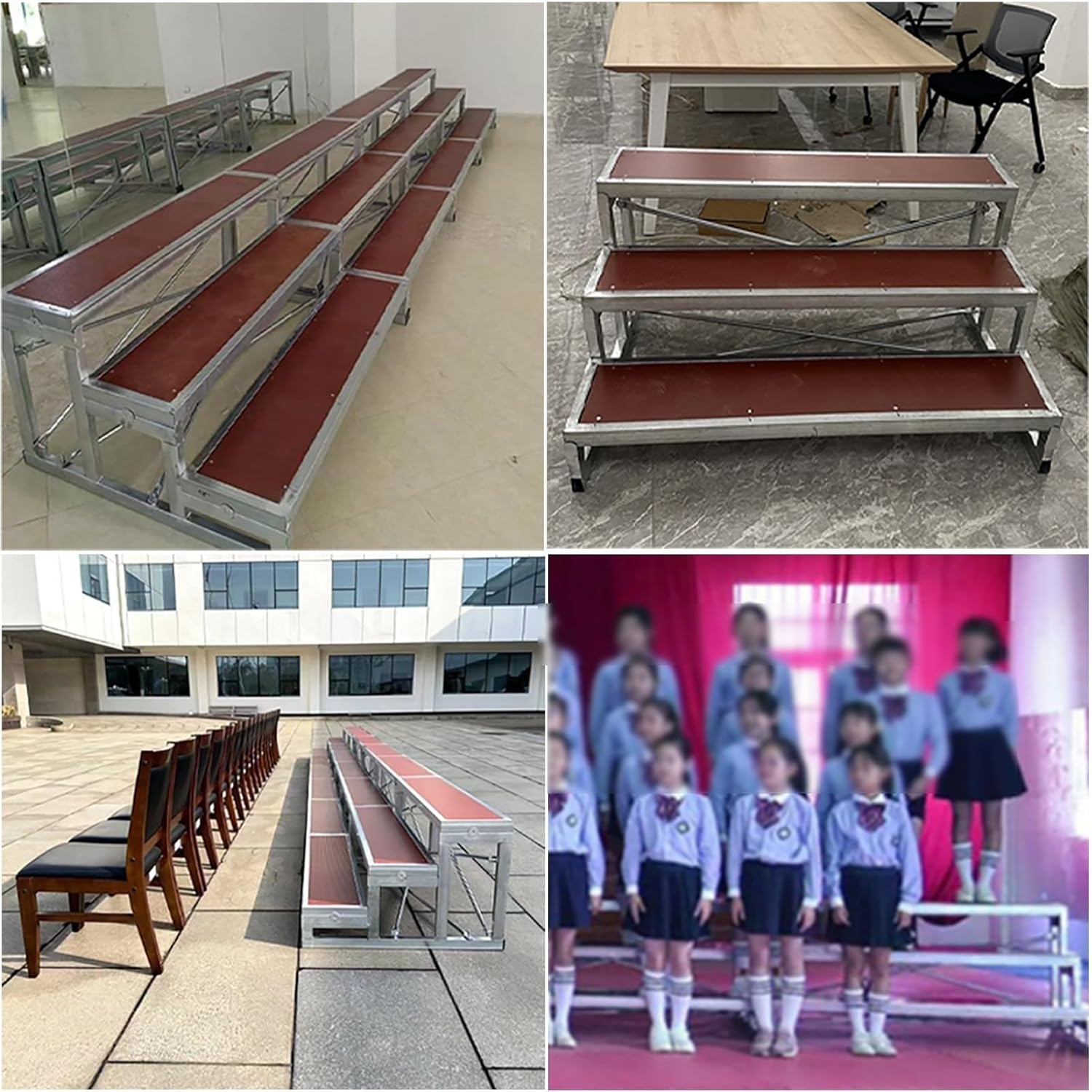 Choir Risers Folding Choral Stairs Stage Riser Platform Based Metal Anti-Slip Portable Stage Platform Multi-Leve,Our choir risers are designed to enhance performances for groups of all sizes, adding a touch of elegance and professionalism to every event. Whether you are preparing for a concert, a classroom presentation, or a theatrical production, our risers offer the ideal solution for creating an impressive stage setup. **Specifications:** - **Material:** Durable plywood and galvanized steel for lasting strength - **Tiers Available:** Choose between 2 or 3 tiers - **Capacity:** Each tier supports up to 3 people, accommodating a total of 500kg (1102 lbs) for optimal stability - **Dimensions:** Available in sizes 128 x 60 x 40cm and 128 x 90 x 60cm **Key Features:** - **Robust Construction:** Built to withstand the rigors of repeated use while maintaining structural integrity. - **Safety First:** The anti-slip surface enhances safety for performers, allowing them to focus on their performance. - **Time-Efficient Assembly:** Designed for quick setup, our risers save valuable time during event preparations. - **Versatile Use:** Perfect for various settings, including concert halls, group photos, classrooms, and theaters. **Package Contents:** - 1 x Choral Risers **Important Notice:** - Weight-bearing capacity is contingent upon proper use within specified limits. - Color variations may occur due to different monitor settings and lighting conditions. - Manual measurements may yield slight discrepancies of 1-3 cm; please refer to actual sizes for precision. Should you have any inquiries, our dedicated customer service team is available 24/7 to assist you. Elevate your performance with our reliable choir risers and create memorable experiences for your audience.