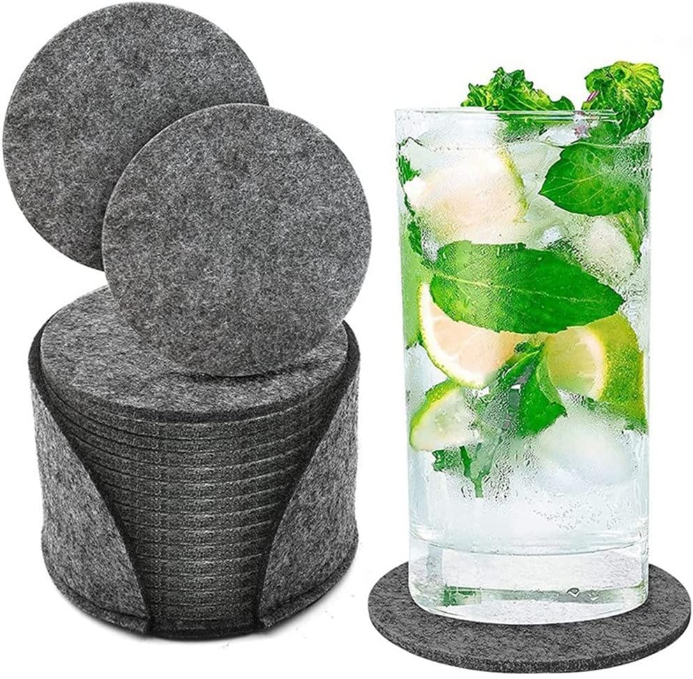 The round grey coasters are made of felt material, which is made of polyester, simple yet elegant. Don't let spilled water get onto the table's surface.They are non-slip, stay in place and do not budge, large enough to support a cup, a bottle or a mug. Naturally non-slip (they stay in place / do not slip) and highly resistant to hot/cold liquids and stains. Thick and felt coasters that won't break even after repeated use. These non-slip coasters prevent scratches, stains, blemishes or damage that may be caused by glasses or cups on your surfaces. Multifunctional: These coasters are suitable for all types of tables: wood, granite, soapstone, marble, stone tables, coffee tables, dining tables. It is a real pleasure to place your glass or mug on of them; they are good for hot or cold drinks.Specification: Material: feltSize: single piece: 10x0.5cmPackage Contents:14 * Felt coasters1 * Iron holderNotes: 1. Only sell main products, not other products.2. Since manual measurement is required, please leave a space of 1-3 cm.3. Due to screen differences, the color may be slightly different from your expected color, please allow.Remind:After receiving the packaging, please check the packaging and the product carefully. If the received item is defective or has any questions, please us via email to resolve the problem. We will reply as soon as possible and do our best to meet yourTons of styles for formal dress shirt, suit & tuxedo are best match for wedding, formal business meeting, prom, interview, casual party, banquet, ceremony and all precious moments.
