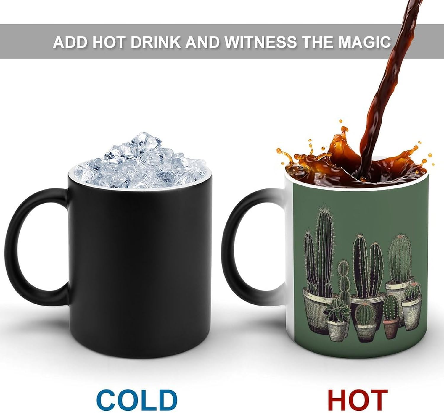 This unique color changing cups is easy to clean, Please scald it with boiling water before using it after receiving it to remove the dust generated during the production process of the cup. It is reusable, Not suitable for dishwashers, only hand wash The Green Cactus printed reusable color-changing cups are perfect for decorating your kitchen, restaurant or cafe. You can judge whether the coffee is cold by the color of the magic cup, so as to avoid drinking cold coffee