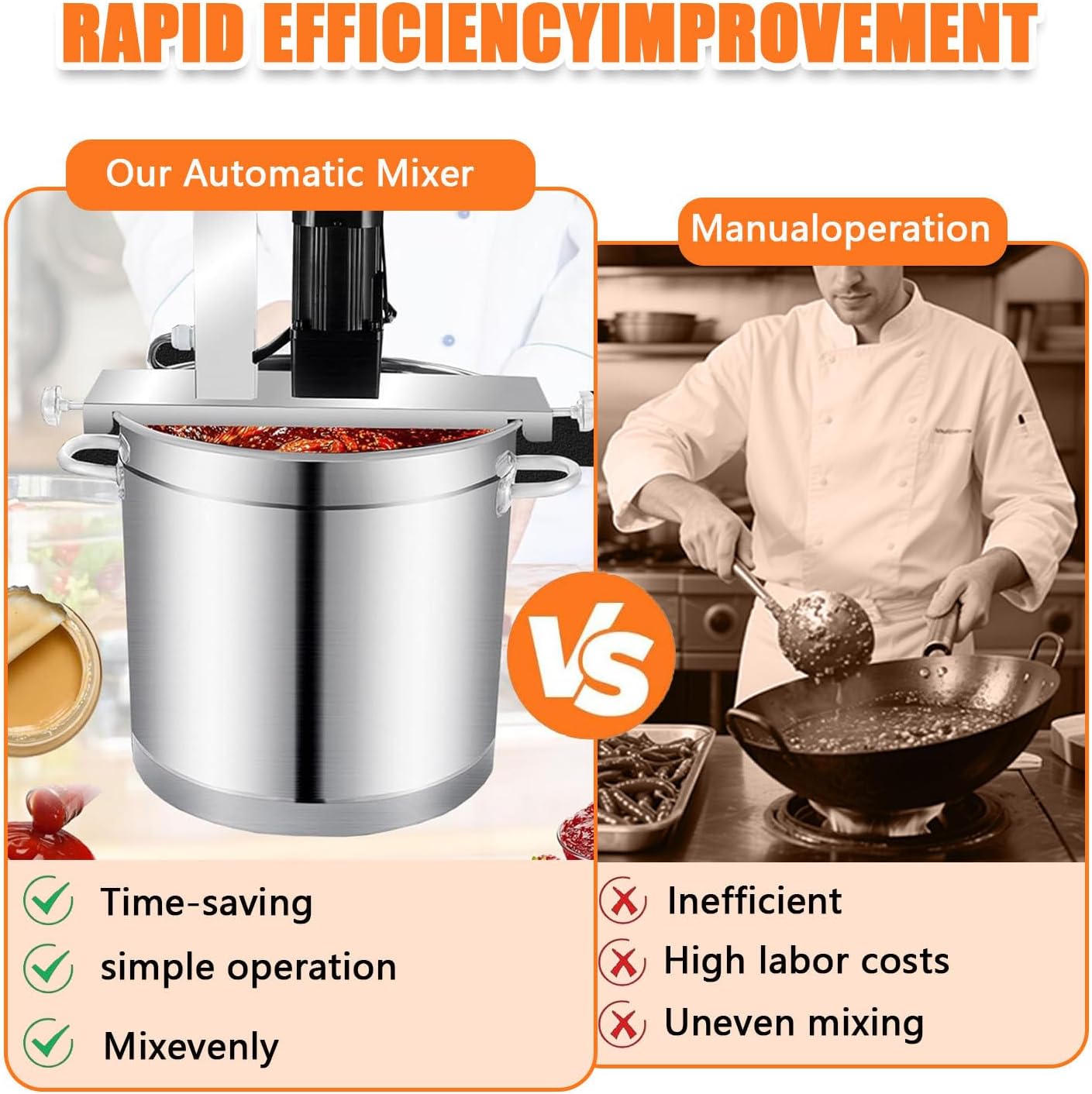 The Automatic Mixing Jar is a highly efficient kitchen appliance tailored for both home cooks and professional chefs who frequently create jams, sauces, and various sticky fillings. Its multifunctional design makes it an excellent choice for commercial environments, including dessert shops, restaurants, and snack stands. One standout feature is the stable scraper, which ensures a smooth stirring process without any shaking, allowing for consistent results every time. The 3-layer composite stainless steel frying pan is built to last, providing durability and a strong load-bearing capacity, making it perfect for heavy-duty use. Additionally, the removable fixing knob keeps the blade securely in place, preventing any unwanted movement during operation. This feature also allows for easy assembly and disassembly, enhancing the appliance's longevity. The user-friendly control interface enables automatic frying, eliminating the need for manual labor and making it accessible for everyone, regardless of cooking experience. The high-quality solid handle is designed to endure, capable of bearing up to 300kg, ensuring safety and reliability during use. Specifications include: - Name: Automatic Food Mixer Machine - Core Components: Motor - Material: Stainless Steel - Type: Cooking Equipment - Heating Source: Suitable for gas stoves, induction cookers, electric ceramic stoves, etc. - Voltage: 110V/220V - Motor Power: 200-400W - Barrel Volume Options: 20L, 25L, 40L, 60L, 85L - Processing Capacity: 5-75kg Included in the package is one Hot Pot Seasoning Sauce Stir Frying Machine. Please note that this automatic jam blender is designed solely for mixing and does not provide heating; it should be placed directly on a heating source during use. This appliance not only enhances your cooking efficiency but also elevates the quality of your culinary creations, making it a valuable addition to any kitchen.