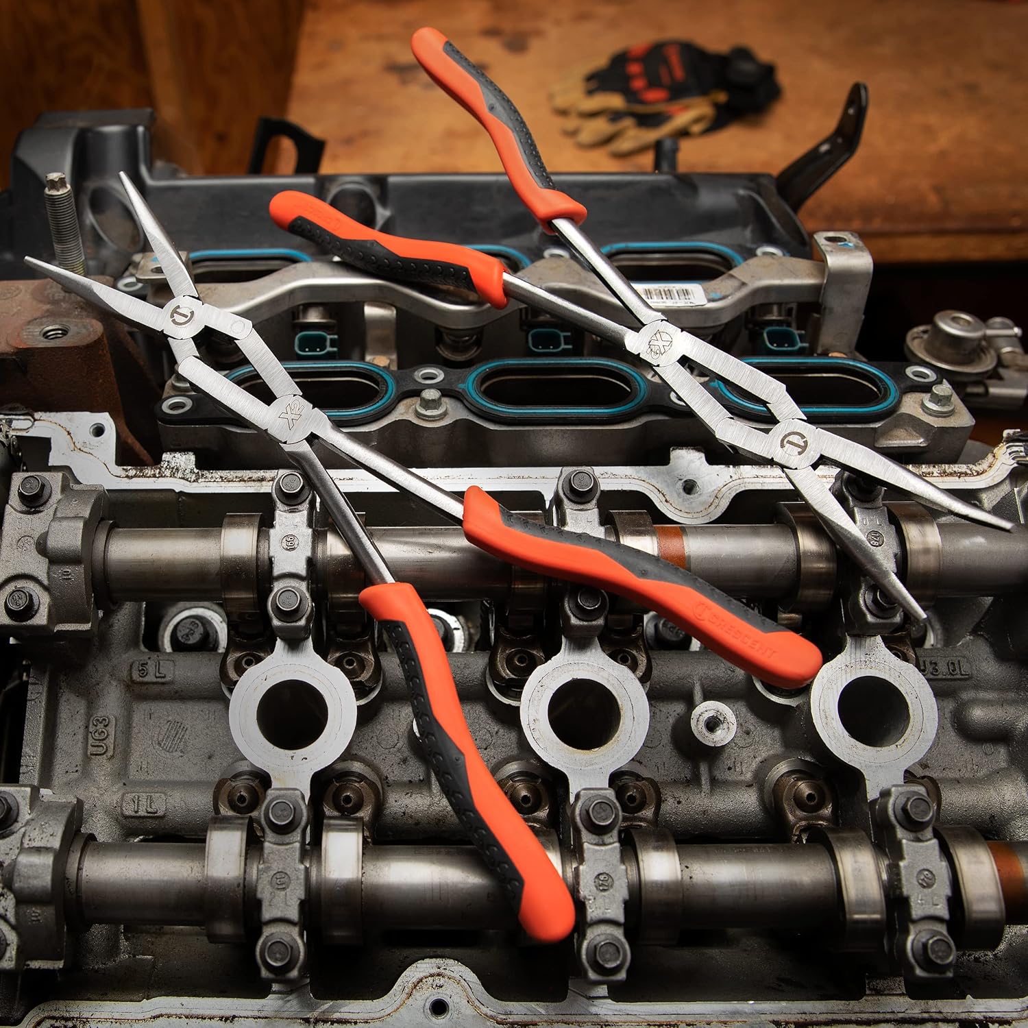 We designed Crescent X2 Long Reach Pliers with double joints so that the jaws can open a greater distance than the handles for improved access in tight spots. These long-nose pliers extend where others pliers cannot go. The PSX204C set includes both straight jaw and bent-nose X2 pliers.