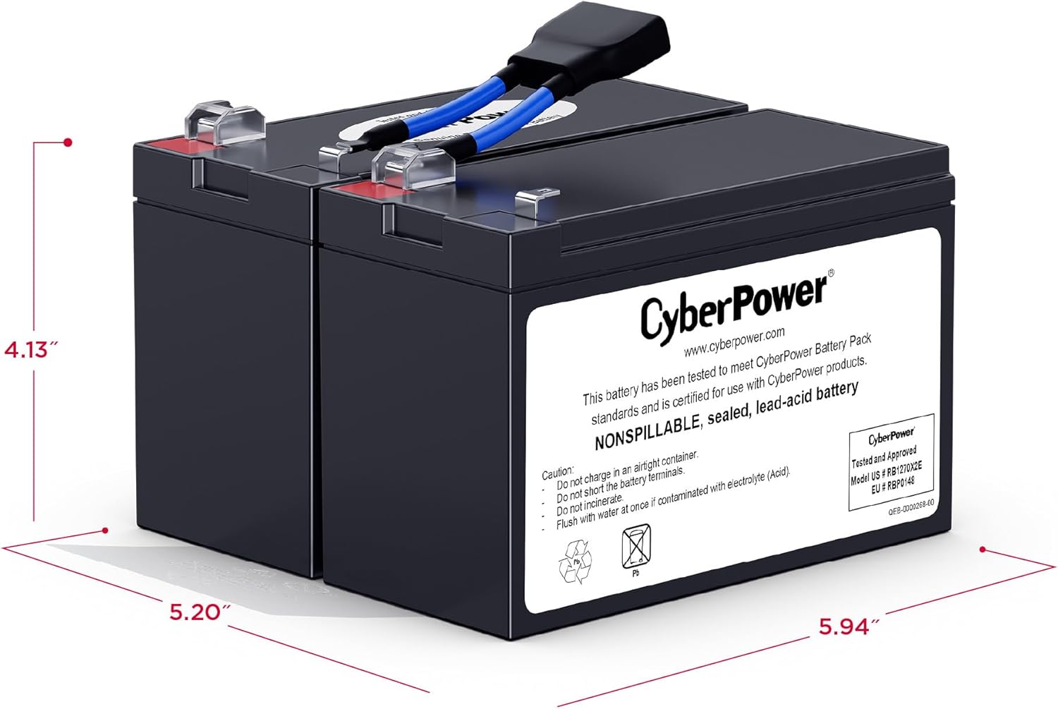 The RB1270X2E UPS Replacement Battery Cartridge restores life to CyberPower UPS systems that have weak or completely depleted internal batteries. The RB1270X2E contains two 12V/7Ah batteries, certified to meet or exceed original manufacturer specifications. This leak-proof, sealed lead-acid battery never requires replacement fluid. The pre-assembled cartridge installs easily into your CyberPower UPS system and is shipped with reusable packaging for delivering expired batteries to a suitable recycling center. The RB1270X2E comes with instructions, recycling information, and an eighteen-month warranty. UPS Compatible: M550L.