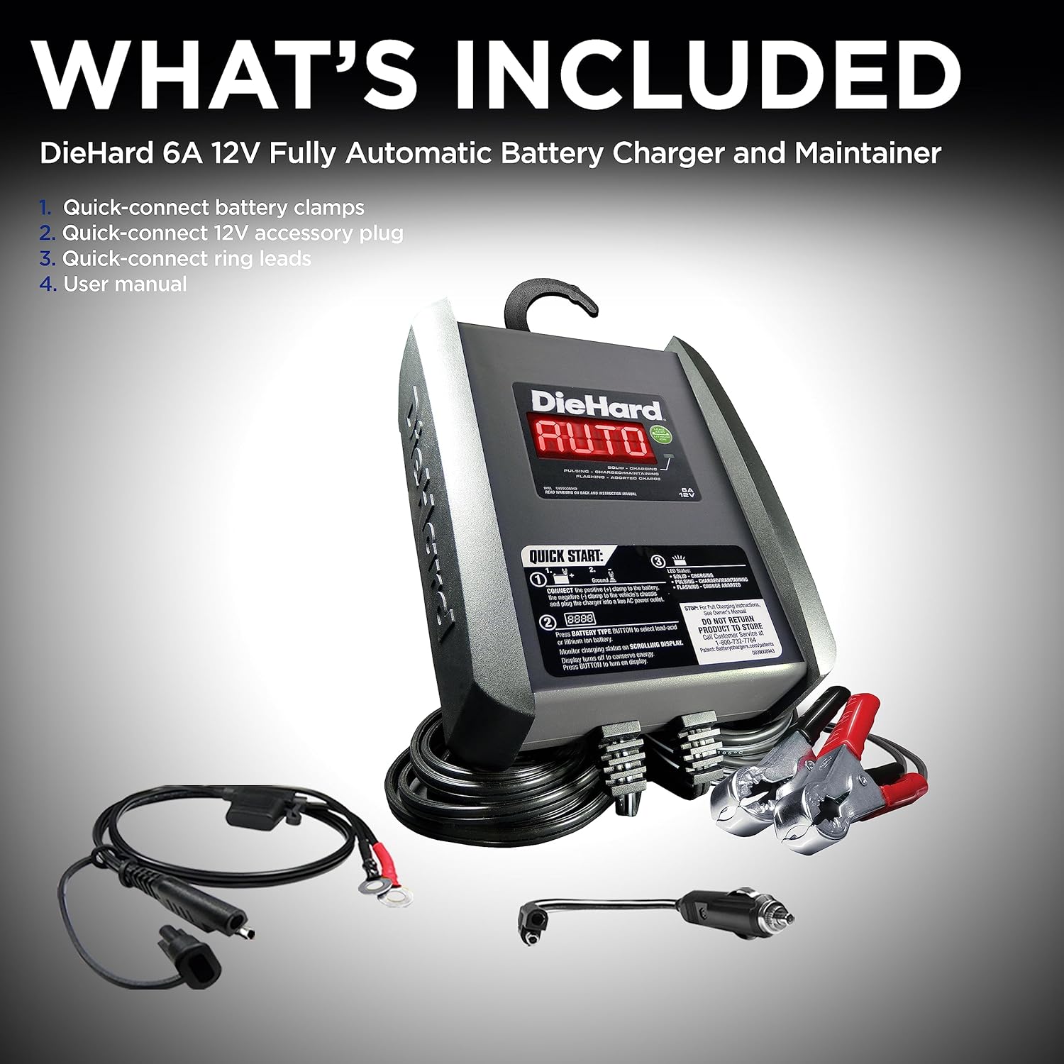 The Diehard DH6L is a 6A 12V Fully Automatic Battery Charger. It is an energy-efficient, fully automatic charger that is perfect for most 12V batteries, including lithium ion (LiFePO4), AGM, standard and gel cell types. Charging is easy, and it has a scrolling digital messaging which provides step-by-step instructions to properly charge your battery. The quick connectors attach in seconds, to make setup a snap.