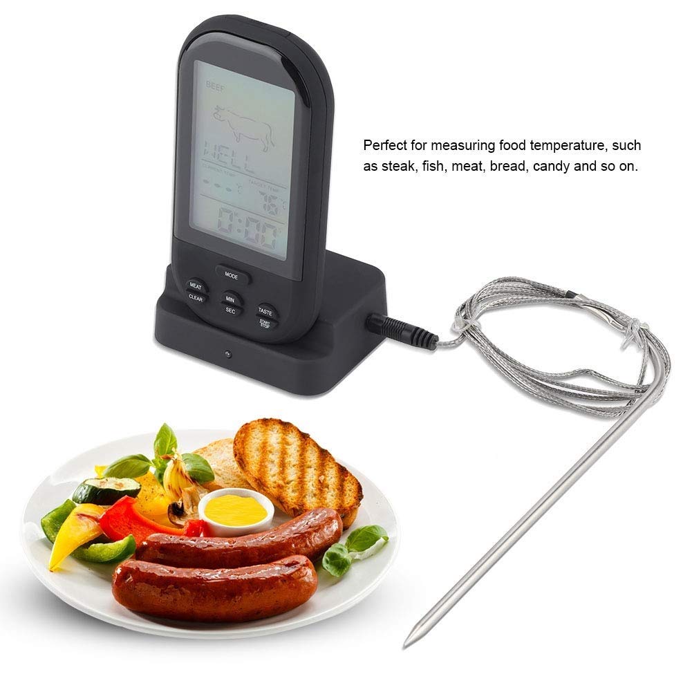 Specifications:Condition: Material: shell + Stainless steel probeColor: Temperature Measuring Range: 0~250℃(0~482°F)Measurement error: ±1℃Unit Switch: ℃ / °FBattery: 4pcs AAA batteries(Not included)Size of thermometer: Approx.12 x 6.2cm / 4.72 x 2.44inSize of probe: Approx.17 x 5.3cm / 6.69 x 2.09inLength of connecting cable: Approx.103cm / 40.55inSize of base: Approx.7.5 x 5.5 x 2.5cm / 2.95 x 2.17 x 0.98inPackage Included:1 * Touch Screen Food Thermometer(Battery not included)1 * Probe1 * Standing baseNote:This plastic food thermometer will not be left in the food while cooking, otherwise the inner electronic elements of this thermometer will be damaged.Do not put the thermometer into the ovens.Keep the thermometer away from water.Please allow 0~1 inch error due to manual measurement. Thanks for your understanding.Monitors are not calibrated same, item color displayed in photos may be showing slightly different from the real object. Please take the real as standard.