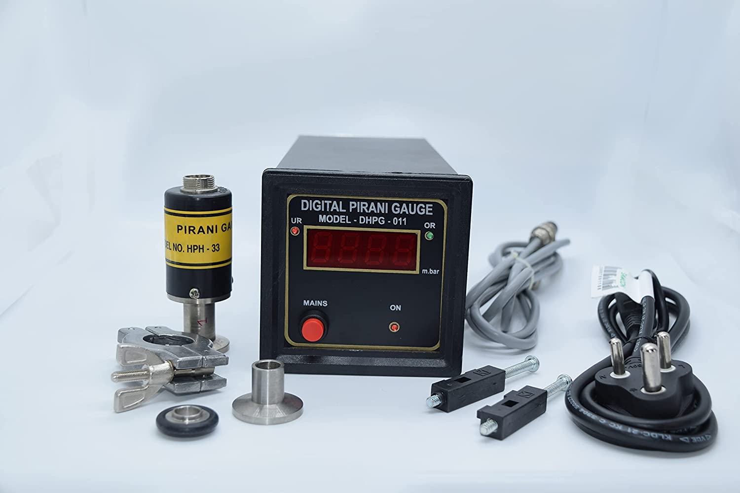 Digital Pirani Gauge has an intelligent microcontroller design and works based on the principle of measurement of thermal conductivity of gases. The display of Pirani Gauge is a 4 Digit 7 segment LED display with an auto decimal resolution setting. The Digital Pirani Gauge comes with a single gauge head or an optional dual gauge head enabling the use of one instrument to measure the vacuum of 2 points. The Vacuum Gauge is a direct replacement for the conventional Analog Pirani Gauges and is mainly operated on Single Phase, 230 V.A.C. supply.