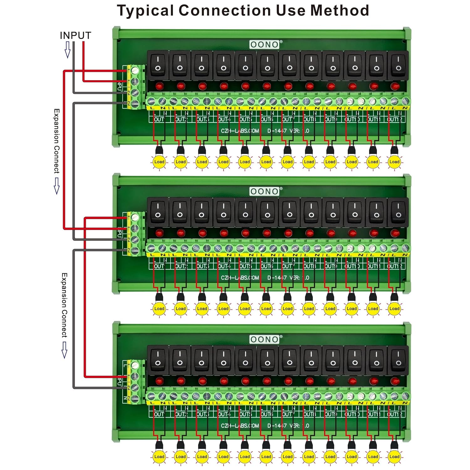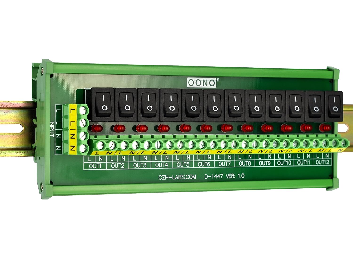 1, Working voltage AC 70 to 250V. Maximum total input current 30 Amps. 12 Channels output, each channel maximum output current 10 Amps. 2, Input terminals pitch 7.62mm/0.3 inch, maximum current 30 Amps for per position, wire size 26 to 10 AWG, stripping length 8mm, Metric M3 slotted screw. Support power supply expansion connect to other modules. 3, Output terminals pitch 7.62mm/0.3 inch, wire size 26 to 10 AWG, stripping length 8mm, Metric M3 slotted screw. 4, Rocker switch ON/OFF power output for each channel. With switch power ON LED indication function. 5, High quality fireproof nylon material DIN rail mount carrier, can support width 35mm 32mm 15mm rail. FR-4 fiberglass dual copper layers PCB.