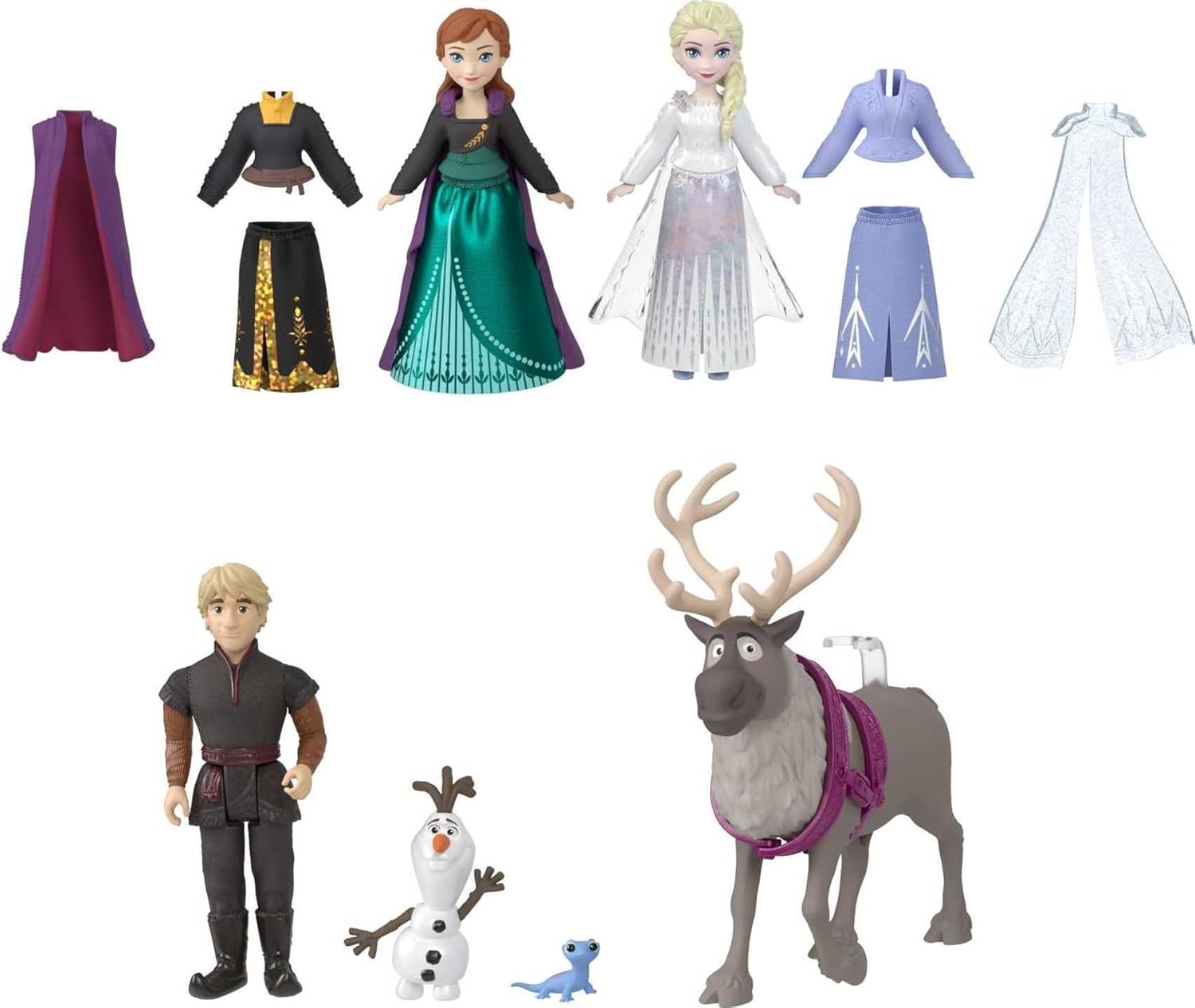Adventure awaits with this Disney Frozen friends and fashions pack inspired by Frozen 2. In charming small-doll scale, this set includes posable Anna, Elsa and Kristoff dolls; Olaf, Sven, Bruni, and the Water Nokk figures; and 4 signature outfits for Anna and Elsa! Kids will love re-creating favorite movie moments or imagining new adventures with these beloved characters. Dolls cannot stand alone. Colors and decorations may vary.