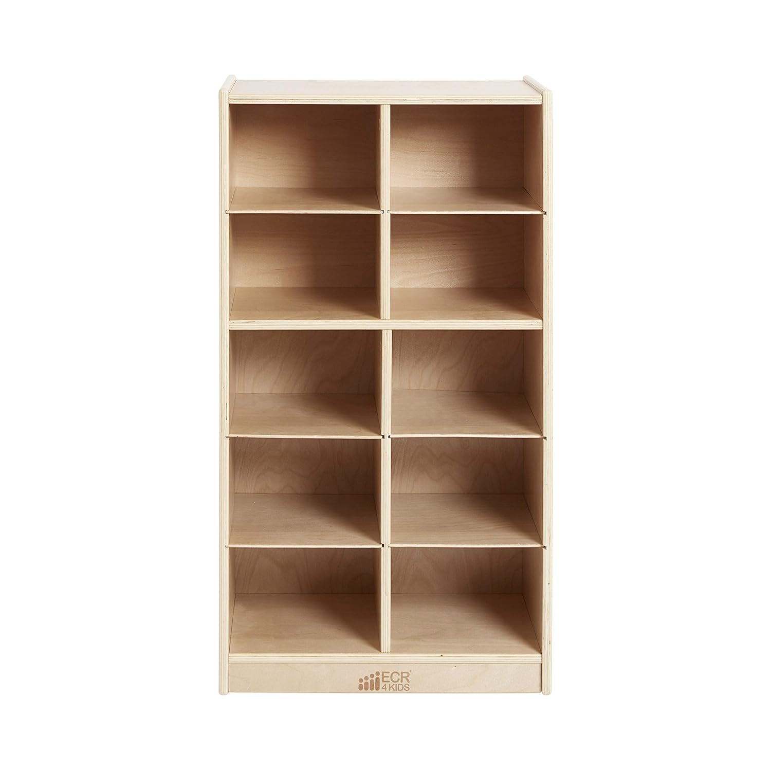 Keep your classroom or playroom uncluttered with the ECR4Kids 10 Cubby Mobile Tray Storage Cabinet with Scoop Front Storage Bins. Ideal for small spaces, kids can organize and store toys, games, building blocks, and school supplies that may otherwise be forgotten. Designed to grow with little ones, this storage cabinet with 10 bins helps parents, teachers, and educators keep small items within reach. Give children their own separate cubby at school to store art projects, homework, and personal belongings. Durable plastic bins feature rounded edges, an easy-to-grasp scoop front handle, and a curved interior to simply remove contents. Lightweight bins are easy to pick up and carry between activities.The low-profile open-face shelves encourage little ones to select their favorite activity independently, introduce organizational skills, and clean up when playtime is over. Four casters are included for mobility; move the storage unit from a hallway to the art room. Constructed from sustainably harvested birch plywood with a durable finish sealing the wood surface and resisting scratching. A UV inhibitor helps furniture resist ultraviolet light and yellowing. Birch plywood is extremely durable and will hold up to everyday use in an early childhood environment.