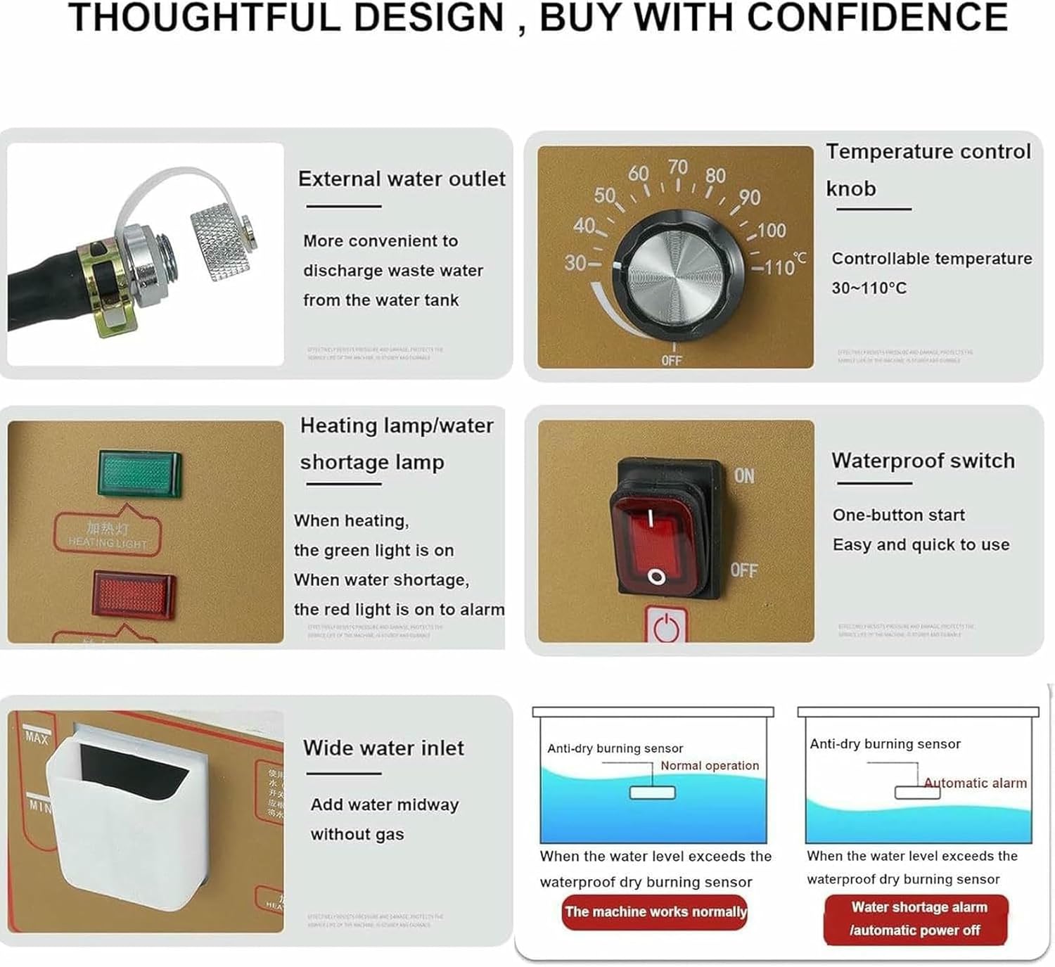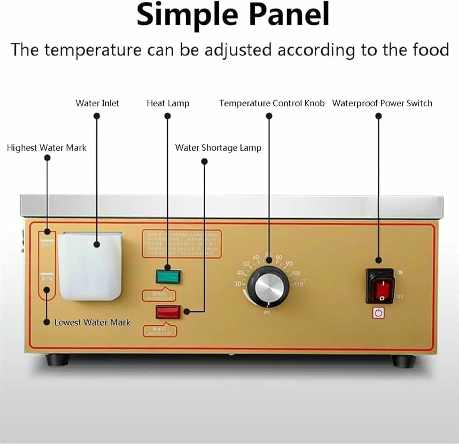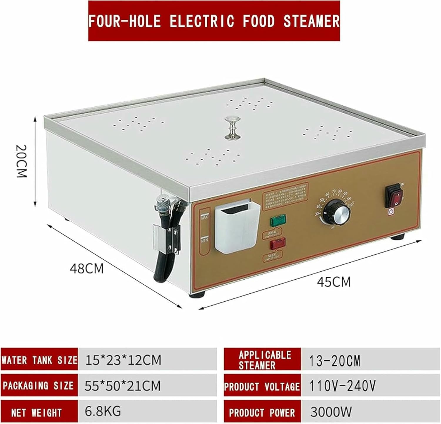 Characteristics1. Two, four or six simultaneous steam holes for a wide cooking area2. Wide temperature control range to meet various needs3. Water injection port, automatic alarm in case of water shortage4. Drainage holes to avoid the accumulation of water spots5. Separate design to add and drain water, without interference with each other6. Independent water supply with great storage capacity and long duration7. Antisecado device, surely use.Product parametersMaterial: stainless steelVaporizer: 13-20 cm.Temperature range: 30-110 ° CPower: 2000/3000 W/4000 WVoltage: 220 V-240 VFood: buns, dumplings and other pastaOccasions: breakfast stores, canteens, restaurants and other commercial premisesVaporizers: steel, iron, wood, bamboo, etc.Package content: electrical vaporizer * 1