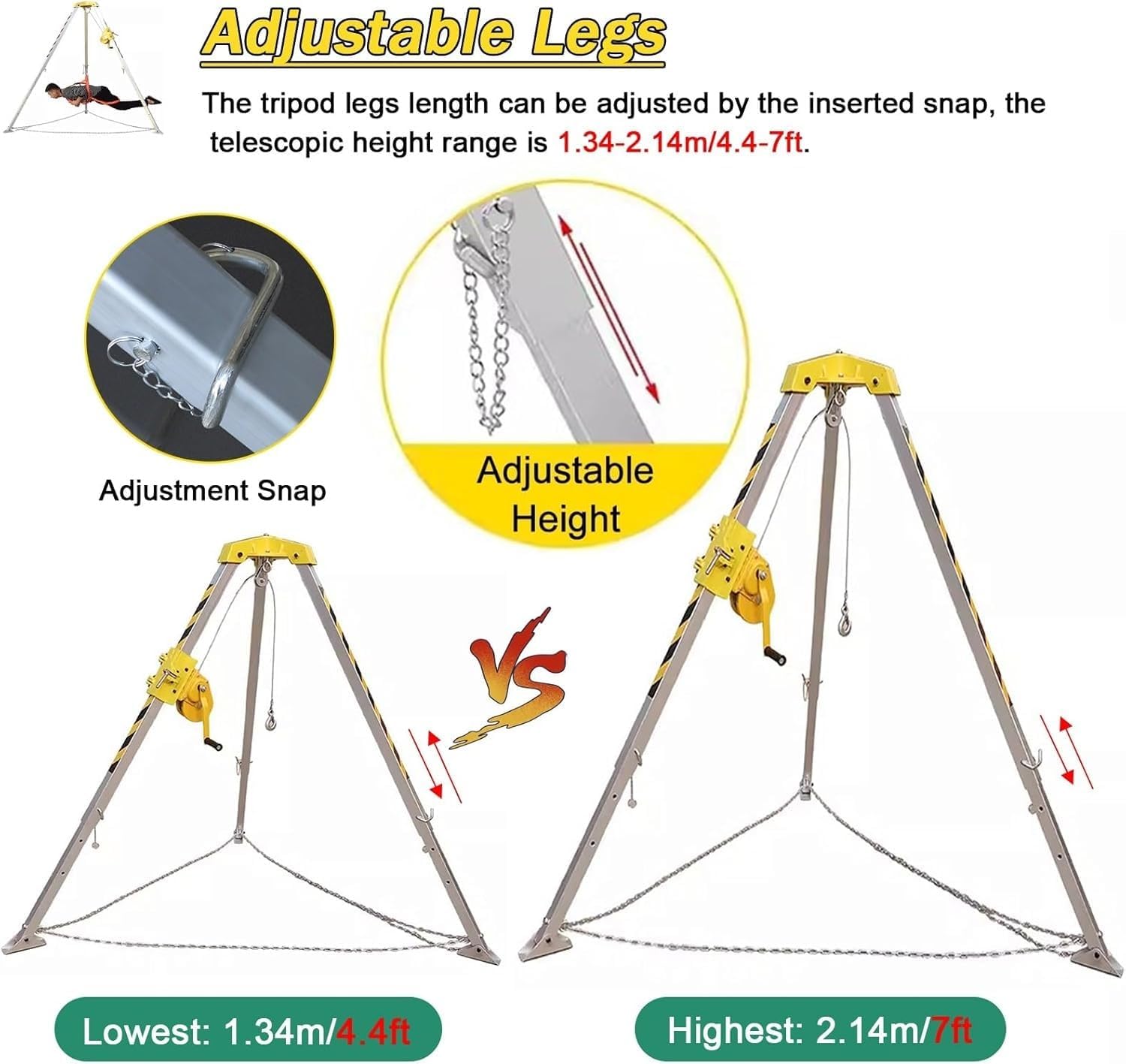 Emergency Firefighting Rescue Rope System: Specifications - Material: High Strength Lightweight Aluminum Alloy - Wire Cable Length: 1200LBS winch-20m/65.6ft-Dia 4mm, 1800LBS winch-25m/82ft-Dia 5mm, 2600LBS winch-30m/98ft-Dia 6mm - Safe Load Capacity: 1200LBS winch safe load 200KG/440LBS; 1800LBS winch safe load 250KG/550LBS; 2600LBS winch safe load 300KG/660LBS - Manual Handle Force: ≤500N - Man Winch Continue Efficiency: 8:1 - Leg Adjustable Length: 1.34-2.14m/4.4-7ft - Safety Factor: 10 - Color: Silver Features Industrial & Occupational Use. Pulley System. The pulley situates the wire rope cable directly over the center point of the tripod providing superior operator balance. Winch is built with tough steel housing to ensure high performance within the harshest environments. 3 Protection Chains. Strengthens support for demanding confined space applications. Adjustable & Non-Skid Feet. There are yellow and black reflective strips on the legs, which are used to warn passers-by to "keep away" during construction. The tripod can be set up and dismantled without use of tools. Package Content: - 1xConfined Space Tripod Kit ( Includes winch, steel cable, safe belt) Notice: - Manual measurement, there will be 1-3cm error, please understand - Due to light and personal differences in color understanding, there will be small color difference,in kind prevail