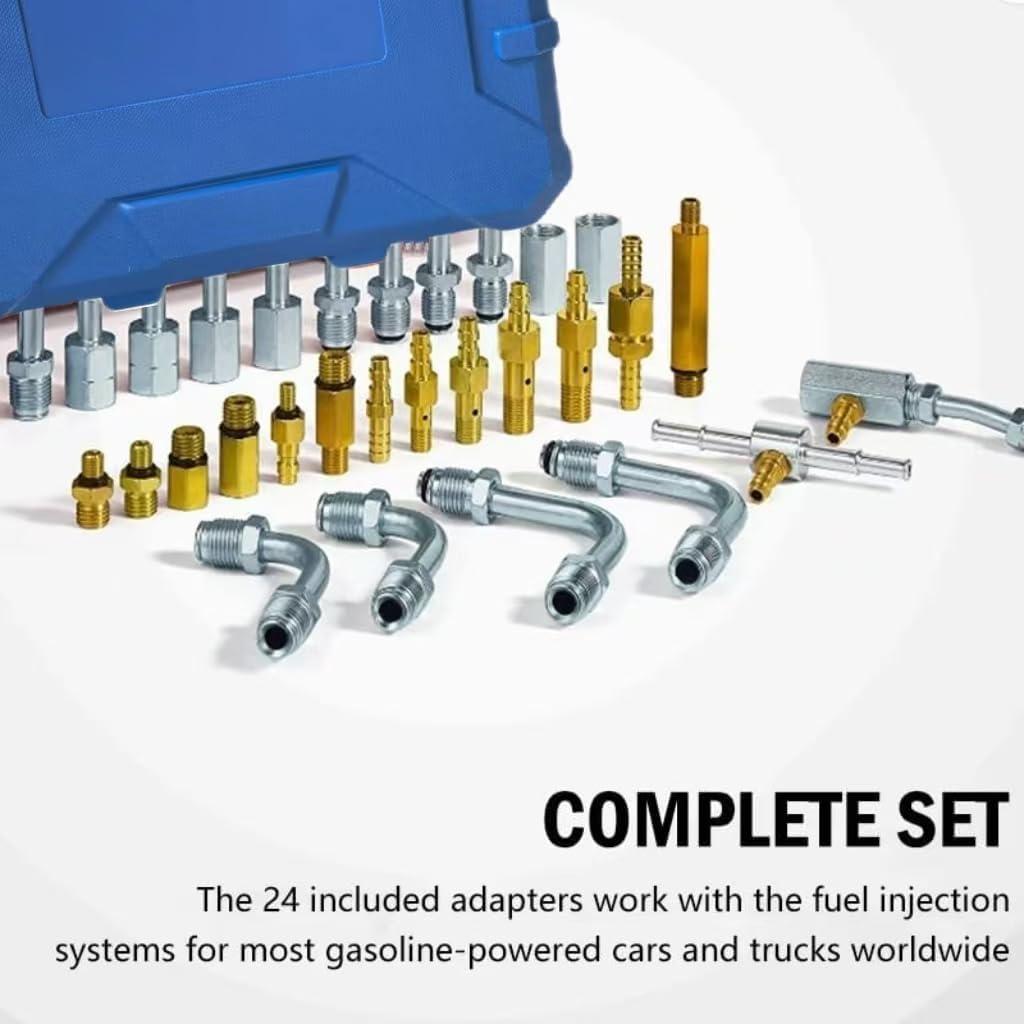 This fuel pressure tester kit is designed for accurate testing of gasoline engine fuel systems. By connecting the pressure gauge to the fuel system test port, users can monitor real-time fuel pressure to help diagnose common issues such as fuel pump wear, pressure regulator problems and injector performance. The automotive fuel pressure tester includes a reinforced hose and multiple adapters, making it suitable for a wide range of gasoline vehicles including cars, trucks, motorcycles and SUVs. Clear gauge readings support reliable engine diagnostics during maintenance and troubleshooting. Whether for professional automotive service or home garage use, this fuel system pressure testing tool provides a practical solution for routine inspection without complex setup.