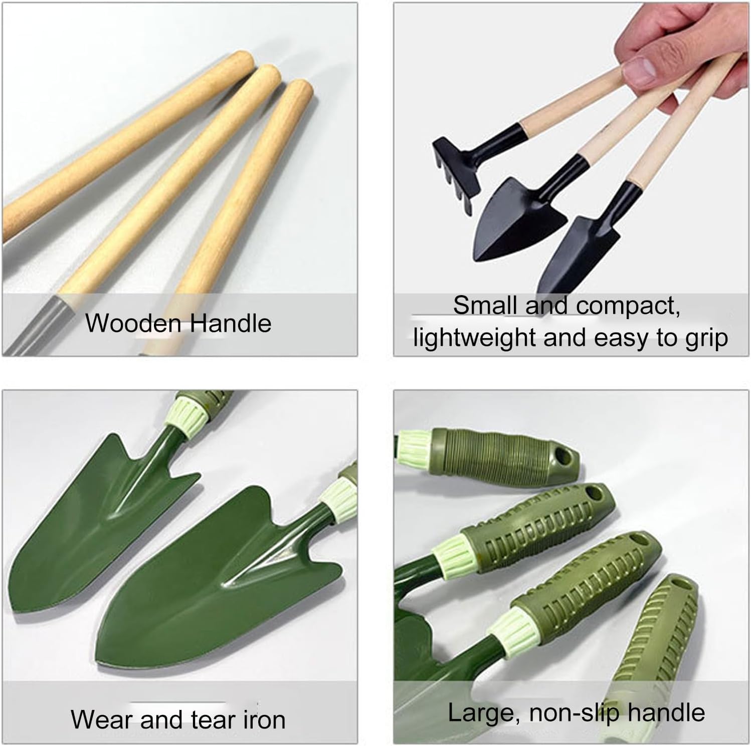 Spec: The gardening tools are made with thick iron, stronger and harder to bend or break. Designed to reduce strain on wrists and hands, the handles provide excellent leverage for digging, planting, and weeding. The portable storage bag is designed to hold all the garden tools to ensure you won't lose any tools, and is easy to carry outdoors. Item Type: Garden Tool Set Tool Bag: Oxford Fabric Tools Structure: Iron 9-Piece Set: Dual Hoe, 5-Tine Rake, 4-Tine Rake, Wide Shovels x2, Narrow Shovels x2, Gardening Apron, Portable Tool Bag Handle Structure: Wood Package List: 1 x Dual-Head Hoe 1 x 5-Tine Rake 1 x 4-Tine Rake 1 x Wide Shovels 1 x Narrow Shovels 1 x Small Wide Shovels 1 x Small Narrow Shovels 1 x Gardening Apron 1 x Portable Tool Bag How To Use: With plastic non-slip handle, for digging, hoeing, and shoveling.