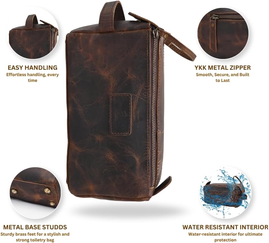 Elevate your travel experience with Autentico Leathers genuine buffalo leather toiletry bag, thoughtfully handcrafted for the modern man. Made from 100% authentic buffalo leather, this bag boasts a rich, rugged texture that ages gracefully, developing a unique patina over time. Designed for practicality, it features multiple compartments and pockets, ensuring all your grooming essentials are neatly organized, whether you're on a business trip, vacation, or at the gym.