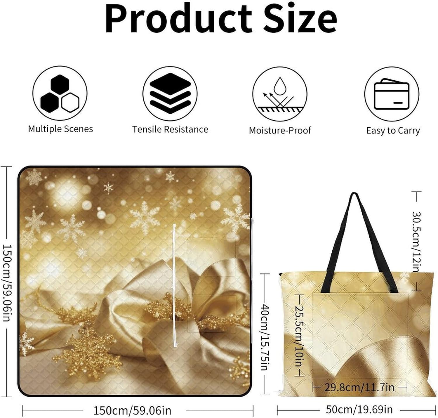 The picnic blanket ,we've only used the highest quality materials, so every picnic is an experience .The underside lining is very sturdy and therefore suitable for every surface. No more worrying about dirty or wet bottoms when you are sitting on damp grass. The Gold Silk Christmas blanket protects you from water, dust and dirt.A large capacity bag and a picnic blanket, 2in1. It has a large capacity and one bag can hold everything you need for going out. You choose the place you want to lie down, and this bag can be turned into a comfortable picnic blanket in seconds also it can fold into tote bag, which is waterproof, sand-proof and wear-resistant.Therefor,you can take it to nearby parks, campuses, beaches or lawn, anywhere you want to lie down.