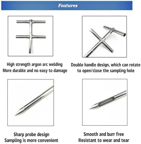 The Double-Layer Rotary Grain Sampler Probe is designed for the efficient collection of precise samples from a variety of granular materials such as rice, wheat, corn, soybeans, and peanuts. Its construction focuses on practicality and durability, making it an indispensable tool for quality control, research, and storage inspections.To use, simply insert the sampler into the granular material, rotate the handle to open the sampling slot, allow the sample to flow into the central tube, then rotate the handle to close the slot. The sampler can then be removed, and the contents discharged by inverting it.Specifications:- Material: 304 Stainless Steel- Diameter: 32mm or 38mm- Design: Double-layer rotary tubePackage Includes:1 x Double-Layer Rotary Sampling TubeNote:- Ensure the sampler is cleaned after each use.- Samples should be analyzed promptly or stored correctly in sealed containers.- For materials that are significantly different, it is advisable to use separate packaging.