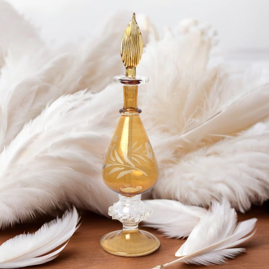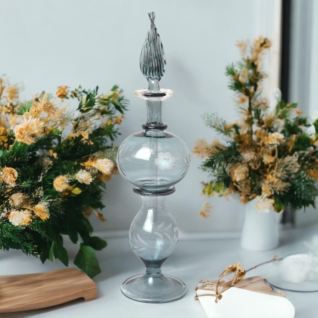 Transform your fragrance storage with this elegant set of handmade blown glass perfume bottles. Featuring a harmonious blend of gray and amber tones, these bottles combine artistry and practicality to create stunning décor pieces while offering versatile functionality.Artisan Craftsmanship: These bottles are meticulously handcrafted by skilled artisans, ensuring every piece is unique and exudes premium quality.Multi-Functional Use: Perfect for storing perfumes, essential oils, or aromatherapy blends. The refillable design is eco-friendly and practical, making it a thoughtful choice for sustainable living.Elegant Aesthetic: The gray and amber tones enhance the beauty of your home décor, fitting seamlessly into both modern and classic interior styles.The Perfect Gift: These bottles make an excellent gift for loved ones on special occasions such as anniversaries, housewarmings, or birthdays. They offer a touch of luxury and sophistication that is bound to impress.Whether as a functional storage option or a decorative accent, this set of gray and amber glass bottles adds timeless elegance to your space. Order today and experience the charm of artisanal glassware.