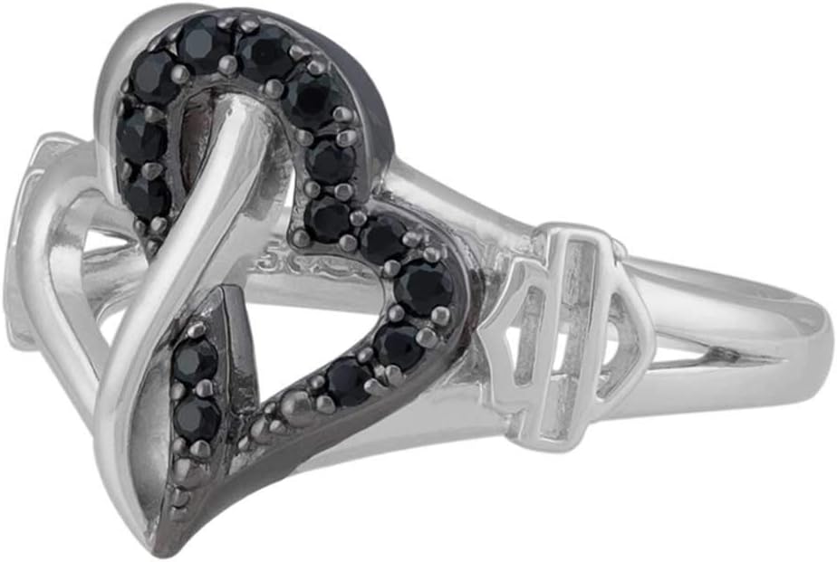 Harley-Davidson Women's Black & White Infinity Hearts Ring, HDR0557. The perfect addition to the 2021 Valentine's Day Collection. Constructed from high-quality, shiny Sterling Silver. Time-less Bar & Shield logos surrounding a stunning crystal infinity hearts design. This ring is hand-crafted with the highest attention to detail and quality, utilizing the finest materials. This gorgeous ring is yet another must-have to add to your H-D collection. HDR0557