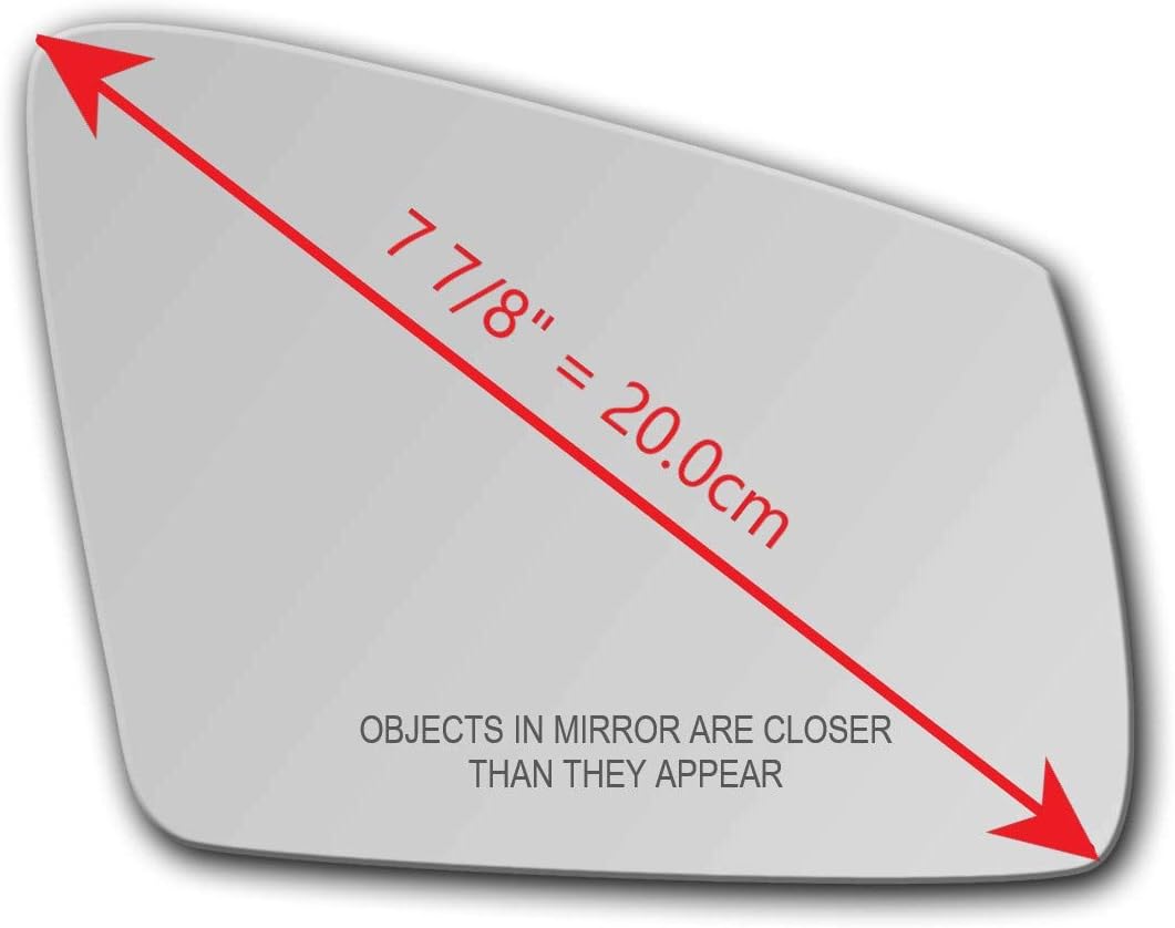 This mirror glass has Diagonal Measure (Longest): 7 7/8 inch = 20 cm Same year/make/model may come with different mirror shape or sizes depending on the markets they released in, options installed, or mirror may have been changed over the course of the life of the vehicle. Please compare actual picture and the longest diagonal dimension provided to your vehicle prior to order to make sure of ordering appropriate fit.
