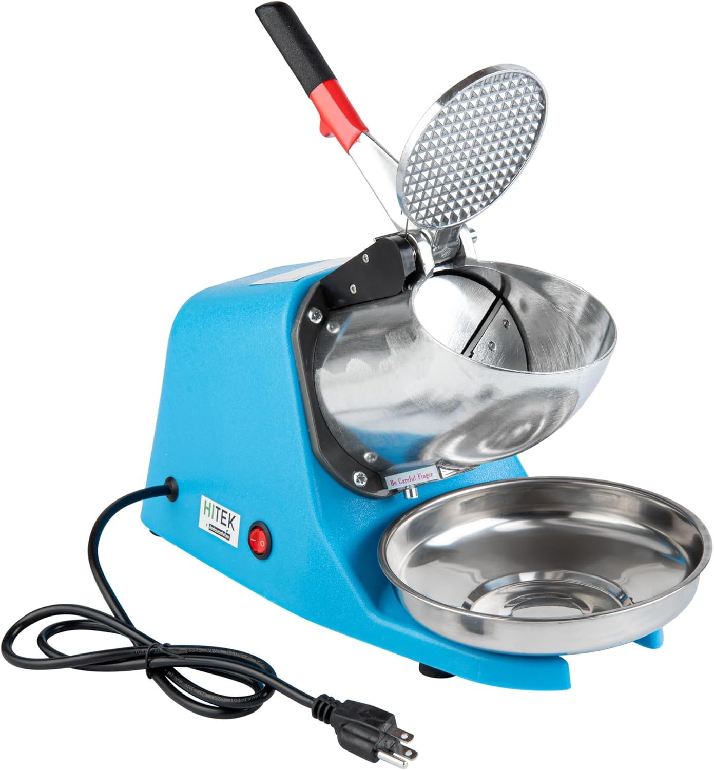 Unleash your culinary creativity with our Hi Tek Blue Countertop Ice Crusher. This commercial ice-shaving machine is powered by a 110V, 350W motor, ensuring optimal performance and durability. Perfect for crafting refreshing snow cones, this shaved ice machine features double stainless steel blades for faster and more efficient ice crushing. This ice shaver facilitates easy operation, and the stainless steel holding bowl makes it a versatile tool for creating optimal shavings of ice for a range of smoothies. Offering a compact design, this electric snow cone machine is easy to store and doesn't take up your valuable countertop space. With a crushing capacity of 143.3 pounds per hour, this shaved ice maker is highly capable and ready to meet your high-volume demands. This ice machine has an attractive blue finish and measures 13.4 inches in length by 6.3 inches in width by 8.3 inches in height, making it a perfect fit for most kitchen layouts. Sold in a 1 count box.