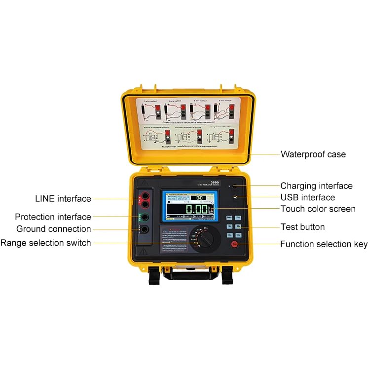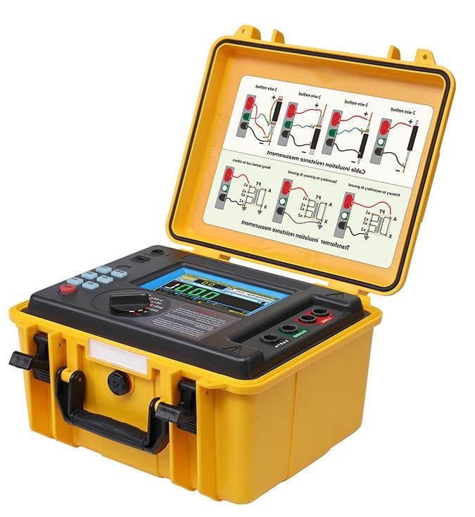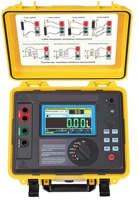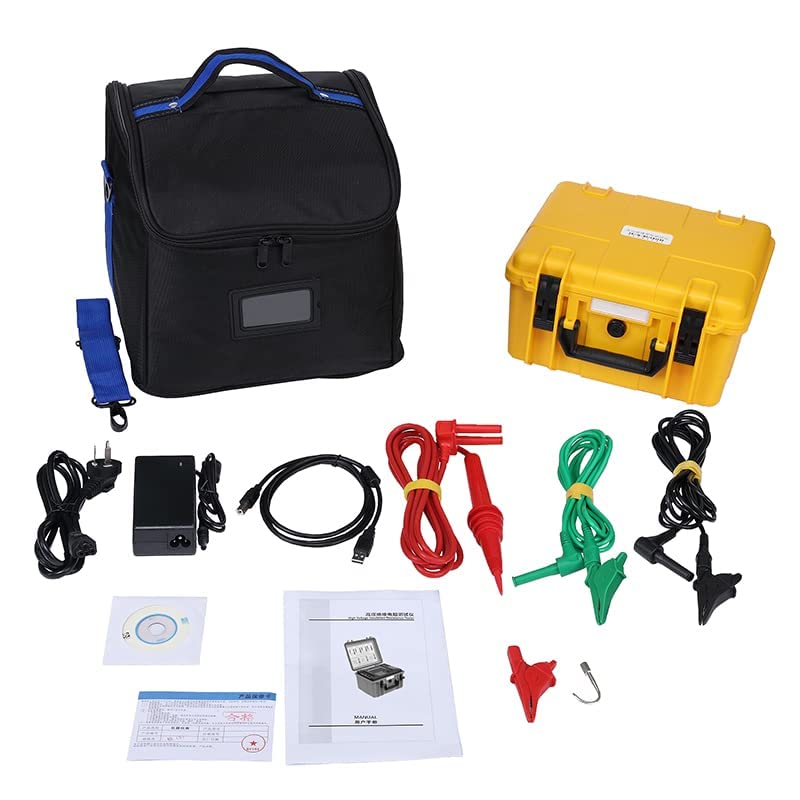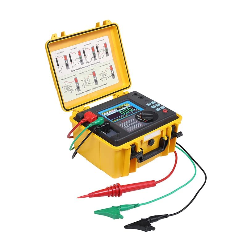 QIUSUO High Voltage Insulation Resistance Tester Intelligent H/V Insulation Resistance Meter with Insulation Resistance Range 0.5MΩ~2TΩ Short Circuit Current >5mA Technical specifications Rated Voltage;250V,500V,1000V,2500V,5000V Output Voltage Accuracy:(5%~10%)±10V Insulation Resistance Range;5KV,2TΩ,5mA Output Short Circuit Current:≥5mA Power Supply:Rechargeable lithium battery pack 5.2Ah Polarization Index Test:Yes Dielectric Absorption Ratio Test:Yes Filtered Resistance Test Mode:10S,20S,30S,40S (4 selection) Voltage Measurement Range: AC/DC 0V~1000V;Accuracy: ±(5%+3V);Resolution: 1V Current Measurement:Range: 0.01nA~6.00mA;Accuracy: ±(5%+0.2nA);Resolution: 1pA Capacitance Measurement:Range: 10nF~25uF;Accuracy: ±(10%+5nF);Resolution: 1nF Voltage Monitor:Monitor the voltage of the measured object, and monitor discharge status after test, Forbidden to test when voltage is larger than 36V, protect instrument and operator. Test Timer:Automatic record test time, time range: 0s~9999s Storage Function:Automatically store the test data with test date and time, total of 1000 groups Upload Function:Upload the stored data to computer with USB communication cable. Battery Power Display:With battery power display, when battery voltage low will remind to replace the battery Automatic Shutdown:After 15 minutes start up will shut down automatically without any operation Meter Dimension:280mm×260mm×160mm Meter Weight:4400g (include battery) Test Wire:Red color high voltage test wire 1 pcs (with alligator clip 1PCS and hook 1PCS), green color test wire 1PCS, black color test wire 1PCS Working Environment:-20℃~50℃;80%rhStore Environment-25℃~65℃;80%rh Insulation Resistance:50MΩ(1000v)(between the test circuit and shell)