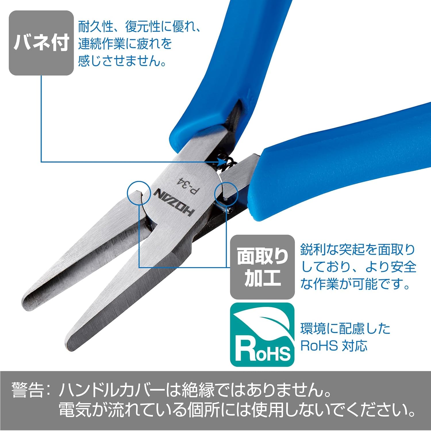 Wide tip, thin type miniature lead pliers Suitable for pulling and bending The blade edge has no knurling processing, so you can work on objects without damaging them. Small and easy to use, and the size fits in your hand will not feel tired even when working for a long time. Moreover, it is very durable. Equipped with a coil spring that will not feel tired even during continuous work. In addition, it also has been chamfered to prevent injuries in consideration of safe work. Adopts an elastomer grip with anti-static specifications (ESD control value: Rg <1 x 10^12Ω). Easy to grip and non-slip grip. In addition, it is environmentally friendly and RoHS compliant. Compact body with a total length of 4.5 inches (116 mm), weight of 1.4 oz (40A must have tool for professional technicians and DIY enthusiasts. Hardness HRC: 42 (ESD Control Value) Rg <1 x 10 - 12 ohms; Weight: 1.4 oz (40 g); Total Length: 4.6 inches (116 mm); Uses: Grabbing and bending wires, electrical wires, wire work, construction and repairing electronic and precision machinery, electronic tools, plastic models, accessories, wire work, fishing hook making, repair.