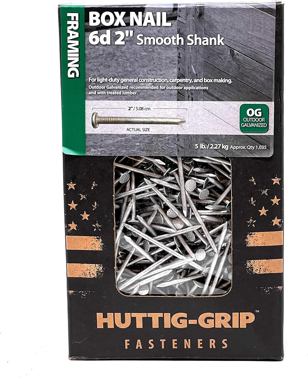 Huttig-Grip 2 in Framing Box Nails 6d Size, Outdoor Galvanized Finish, 5 lb Pack of 1035 NailsGet the job done fast and easy with Huttig-Grip Box Nails! Our nails are designed for light-duty general construction, carpentry, and box making. With a thinner shank and sharp point, you can be sure that splitting in wood will be minimized. Plus, our flat head sits flush against the surface for a neat and clean finish. And with our diamond point tip and outdoor galvanized finish, you can be sure of maximum durability and protection. And, with the outdoor galvanized finish and ASTM F1667-17 standards, you can trust that your work will last through rain or shine. Get your 5 lb pack now to get 1035 nails approximately!SpecificationsBrand: Huttig-GripSeries: FramingModel: Box NailFinish: Outdoor GalvanizedDiameter: 2 inchesSize Code: 6dGauge: 12-1/2Shank Diameter: 0.099 inchesHead Diameter: 0.266 in - 17/64"Shank Type: SmoothApproximate Count in Pack: 1035Package Weight: 5 lbMPN: HGN6OGBX5About Huttig-GripFor more than 130 years, Huttig Building Products has been helping to build the American dream. Founded in 1885 by brothers Charles and William Huttig, Huttig understands the value of teamwork, commitment, and what it takes to be successful every day and for years to come.Today, Huttig is the country’s largest value-added distributor of millwork products such as interior and exterior doors, plus much more. With 27 distribution centers and access to 75%+ of the US housing market, what started out as a saw mill and lumberyard has evolved to become America’s only national distributor of millwork and specialty building products.