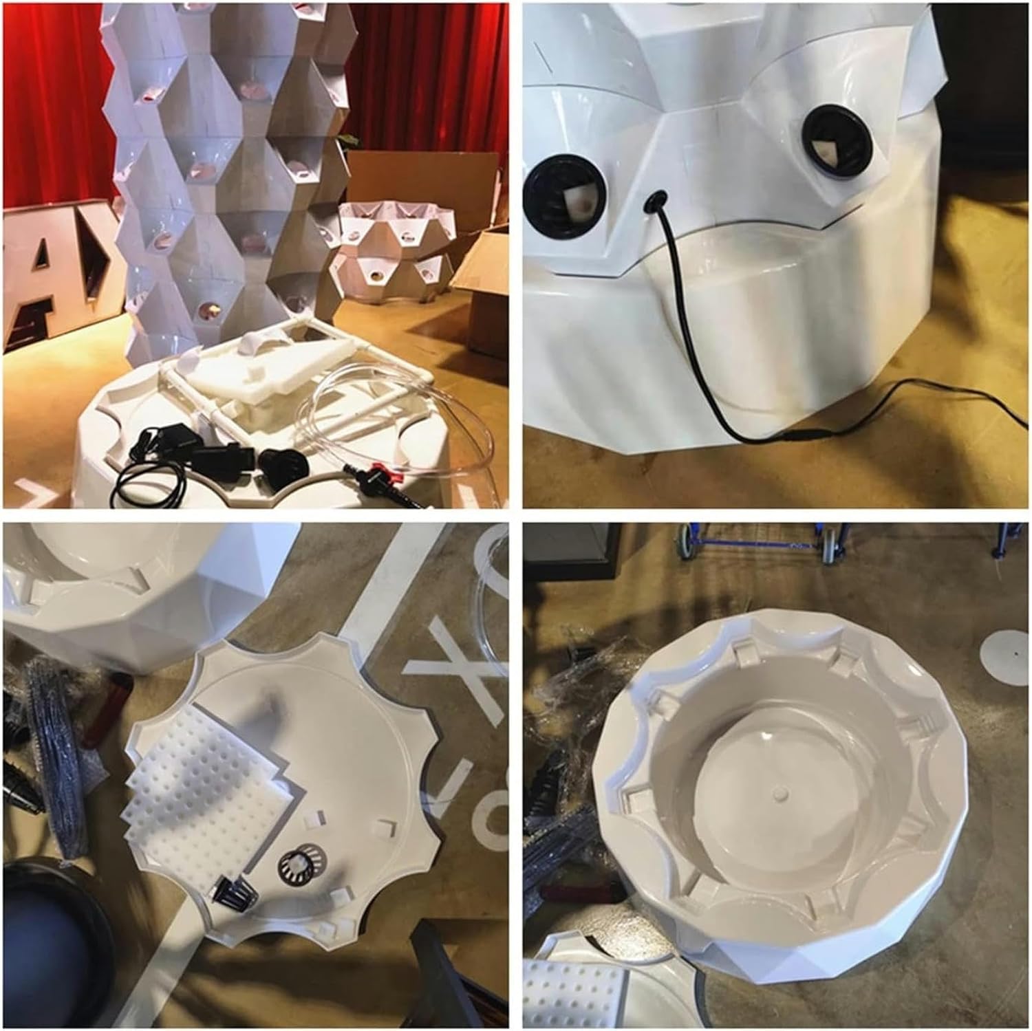 Hydroponics Planter Pineapple Tower Soilless System for Garden Greenhouse Multistoried Planting Indoor Greenhouse--From seed to harvest in 30~60 days, enjoy green food at home~ The column cultivation planting system is composed of a plurality of cultivation bodies and a plurality of planting baskets, and is characterized in that: 8 cultivation bodies are combined into a circle, placed in a water tank and layered up and down to form a three-dimensional planting column. Hang the water inlet fittings on the top level planting theme, connect the water pipe to the top, and cover the top. The cultivation body is a planting area, and the nutrient solution drips from the top through the deflector of each cultivation body to the planting basket below. So as to realize the impact type aerosol and keep the root moist.Including 1.Vertical Growing System Kit; 2.Water Tank; 3.Water Pump; 4.Water Pipe; 5.Planting Basket; 6.Sponge.