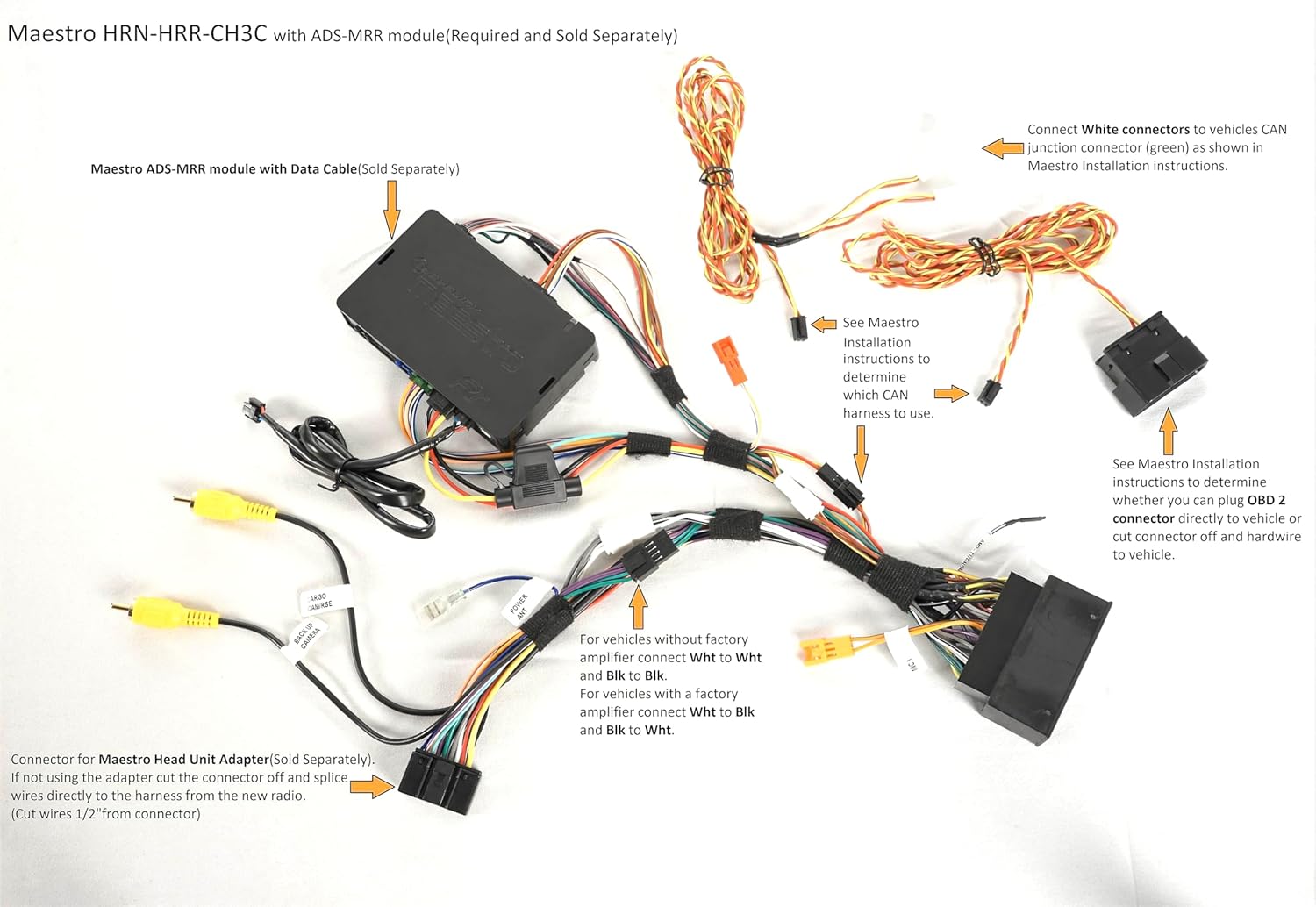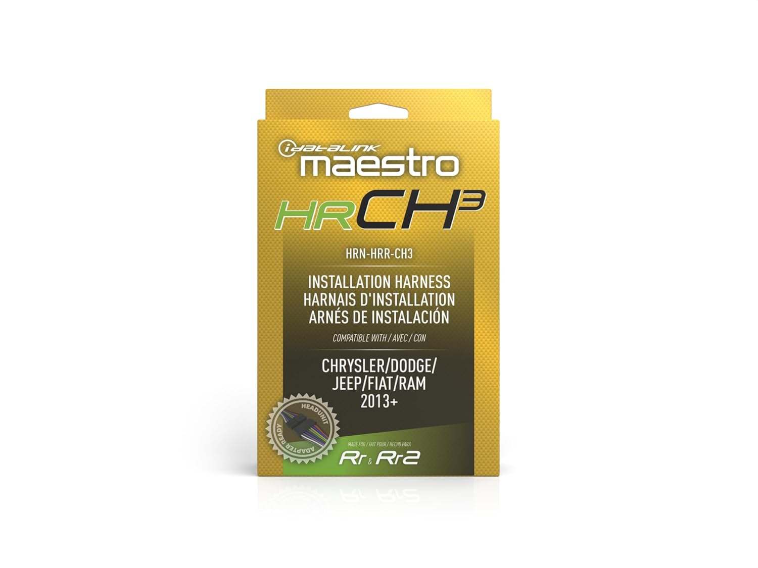 iDatalink working with Chrysler. iDatalink's HRN-HRR-CH3 installation harness simplifies the installation of the Maestro ADS-MRR or ADS-MRR2 Car Radio Replacement Interface module (sold separately) in select Chrysler, Dodge, Jeep, Fiat, and Ram vehicles vehicles when replacing your factory radio with an iDatalink Serial Port compatible car stereo. The package includes connectors that plug in between the Maestro module, your factory radio's wiring plugs, and the serial port on your new car stereo. This harness features an in-line head-unit connector harness, which will plug into their new "Head-unit direct" harnesses for select radio brands. If you're installing a radio that doesn't work with a "Head-unit direct" harness, you simply cut off the plug and connect the wires to the harness included with your new radio. Retain factory features. With select iDatalink-compatible radios from Alpine, JVC, Kenwood, Pioneer, and Sony you'll be able to retain the use of these factory features: ● Touchscreen control of climate control and vehicle settings ● Steering wheel controls ● Use of the factory amplifier, including turn-on, fader, gain, and speed-compensated volume ● Rear-view and other cameras, depending upon aftermarket radio inputs ● Secondary vehicle display (when equipped) ● Rear-seat video and control (when equipped) ● The harness also supplies the outputs (parking brake, reverse, and VSS [Vehicle Speed Sense]) necessary for installation of a NAV receiver, plus illumination and accessory power outputs. Extra features with an iDatalink-ready car stereo. If you're buying a compatible iDatalink-ready car stereo, you'll be able to display vehicle info on your receiver's screen, plus read and reset engine codes. Product highlights: ● Allows installation of a new receiver with iDatalink port in select Chrysler-made vehicles (also requires the Maestro ADS-MRR or ADS-MRR2 module) ● Retains the use of your steering wheel audio controls and factory amp ● Displays engine performance data on touchscreen with select Alpine, JVC, Kenwood, Pioneer, and Sony receivers FeaturesInstallation Harness: The iDatalink Maestro HRN-RR-CH3 installation harness greatly simplifies the installation of the Maestro RR or RR2 Car Radio Replacement Interface module (sold separately) in select Chrysler, Dodge, Jeep, Fiat, and Ram vehicles with a 52-pin radio plug when replacing your factory radio with an iDatalink Serial Port compatible head unit from Kenwood, JVC, Alpine, Sony, or Pioneer. Head Unit Connection: The HRN-RR-CH3 supports iDatalink's Direct T-Harnesses (sold separately) for direct connection to select iDatalink Serial Port compatible head units (including Kenwood, JVC, Alpine, Sony, and Pioneer radios) - replacing the wiring harness that comes with your aftermarket stereo (some hardwiring may still be required). If connecting to an aftermarket head unit that does not support an iDatalink Direct T-Harness, you'll need to cut off and remove the 20-pin black connector from the HRN-RR-CH3 harness and splice each wire directly to the aftermarket radio's corresponding wire. Retained Features: The following factory features (if applicable) are retained when replacing your factory radio with a compatible iDatalink Serial Port head unit from Kenwood, JVC, Alpine, Sony, or Pioneer using the Maestro RR Car Radio Replacement Interface module and HRN-RR-CH3 installation harness. ● Factory Amplifier: Retains factory amplifier with turn-on, fader, gain, & speed compensated volume ● Steering Wheel Controls: Factory steering wheel controls are retained with two function buttons and expandable radio functions. ● Secondary Vehicle Display: Secondary vehicle display is retained (if factory equipped) with audio information and hands-free information. ● Climate Control & Vehicle Settings: Climate display and control is accessible through a compatible aftermarket head unit's touchscreen. You can also access and modify vehicle settings through a compatible aftermarket head unit's touchscreen. ● Advanced Camera Features: Factory backup camera is retained with parking guidelines and park assist chimes (requires ACC-SP1 chime speaker); your aftermarket head unit must have a composite video rearview camera input. You can also add aftermarket front, side, and/or 4x4 cameras (sold separately) to your idatalink compatible head unit that is equipped with multiple camera inputs and your vehicle's factory auto camera switching feature will be retained. ● RSE (Rear Seat Entertainment): Retains factory rear seat video and control (if equipped). Extra Features: The following Extra features are added when replacing your aftermarket head unit with a compatible iDatalink Serial Port head unit from Kenwood, JVC, Pioneer, or Alpine using the Maestro RR or RR2 Car Radio Replacement Interface module and HRN-RR-CH3 installation harness. Vehicle Info: Tire Pressure Display, Battery Voltage Display, Read/Reset Engine Codes, and Door Open Status with Warning. ● Gauges: Selectable Performance Gauges, "Track Pack" Gauges, and Read/Reset Check Engine Codes. Outputs: The HRN-RR-CH3 provides Navigation, Accessory Power, and Illumination Outputs to make installation simpler. ● Navigation: Parking Brake, Reverse Light, and VSS (Vehicle Speed Sense). ● Accessory Power Output: 12V/15A Accessory Power Output ● Illumination Output: Illumination Output *INSTALLATION NOTE: This HRN-HRR Plug & Play T-Harness REQUIRES an Idatalink Maestro Interface Module (ADS-MRR or ADS-MRR2) and the corresponding Idatalink Maestro Car Stereo Head-Unit ACC-HU-ALP1 (Alpine), ACC-HU-PIO1 (Pioneer), ACC-HU-SON1 (S O N Y), ACC-HU-KEN1 (K E N W O O D/JVC with 22-Pin Connector), ACC-HU-KEN2 (KEN/JVC with 16-Pin Connector), ACC-HU-KEN3 (2024 & Newer K E N W O O D/JVC with 22-Pin Connector), ACC-HU-BOS1 (BOSS Radio) or ACC-HU-JEN1 (JENSEN) Installation T-Harness. Sold separately. ADS-MRR: (Vehicle Coverage: 30 Makes - Models: 4318 - Years: 2002+) ADS-MRR