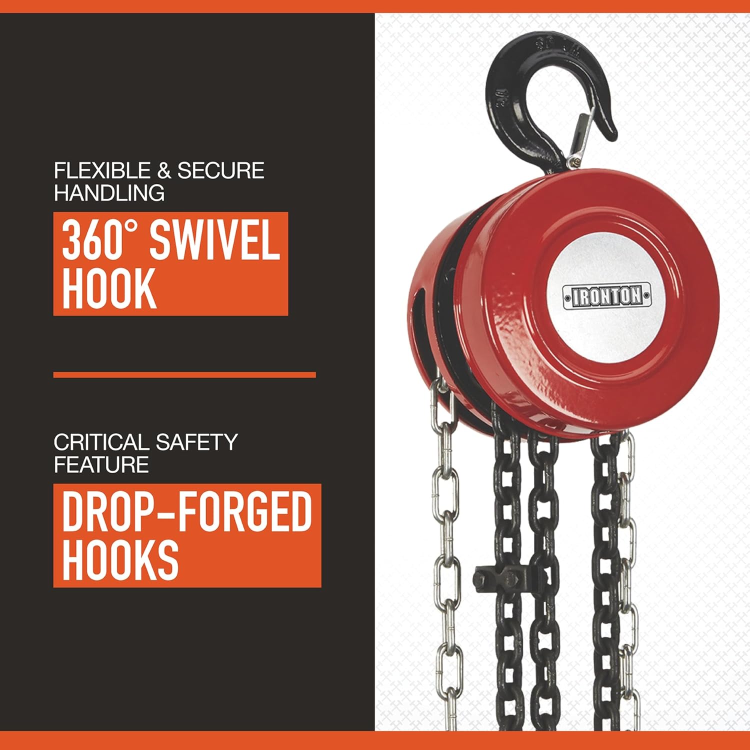 This Ironton Manual Chain Hoist is an industrial-quality hoist with a classic round style and heat-treated double pawls to ensure brake reliability. This unit meets ASME B30.16/ASME HST-2:2014 safety standards and features a Grade 80 load chain for high-level strength. Tough ductile drop-forged hooks ensure noticeable opening when subject to excessive overload. Roller bearing design, black-finished side plate and asbestos-free friction disc ensure smooth operation. Compact design allows low headroom. 360° swivel hook includes a stamping safety latch.